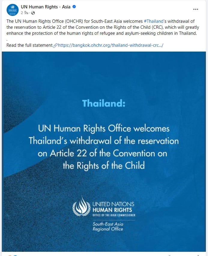 ก่อนหน้านี้ เมื่อวันที่ เมื่อวันที่ 30 สิงหาคม 2567 กรมกิจการเด็กและเยาวชน ได้ประกาศว่า ประเทศไทยได้ยื่นตราสารถอนข้อสงวนของอนุสัญญาว่าด้วยสิทธิเด็ก ข้อ 22 ว่าด้วยการคุ้มครองเด็กผู้ลี้ภัยและเด็กผู้แสวงหาที่พักพิง แสดงให้เห็นว่า ประเทศไทยมีความมุ่งมั่นต่อการปกป้องคุ้มครองสิทธิของเด็กทุกคนอย่างเท่าเทียมและไม่เลือกปฏิบัติ