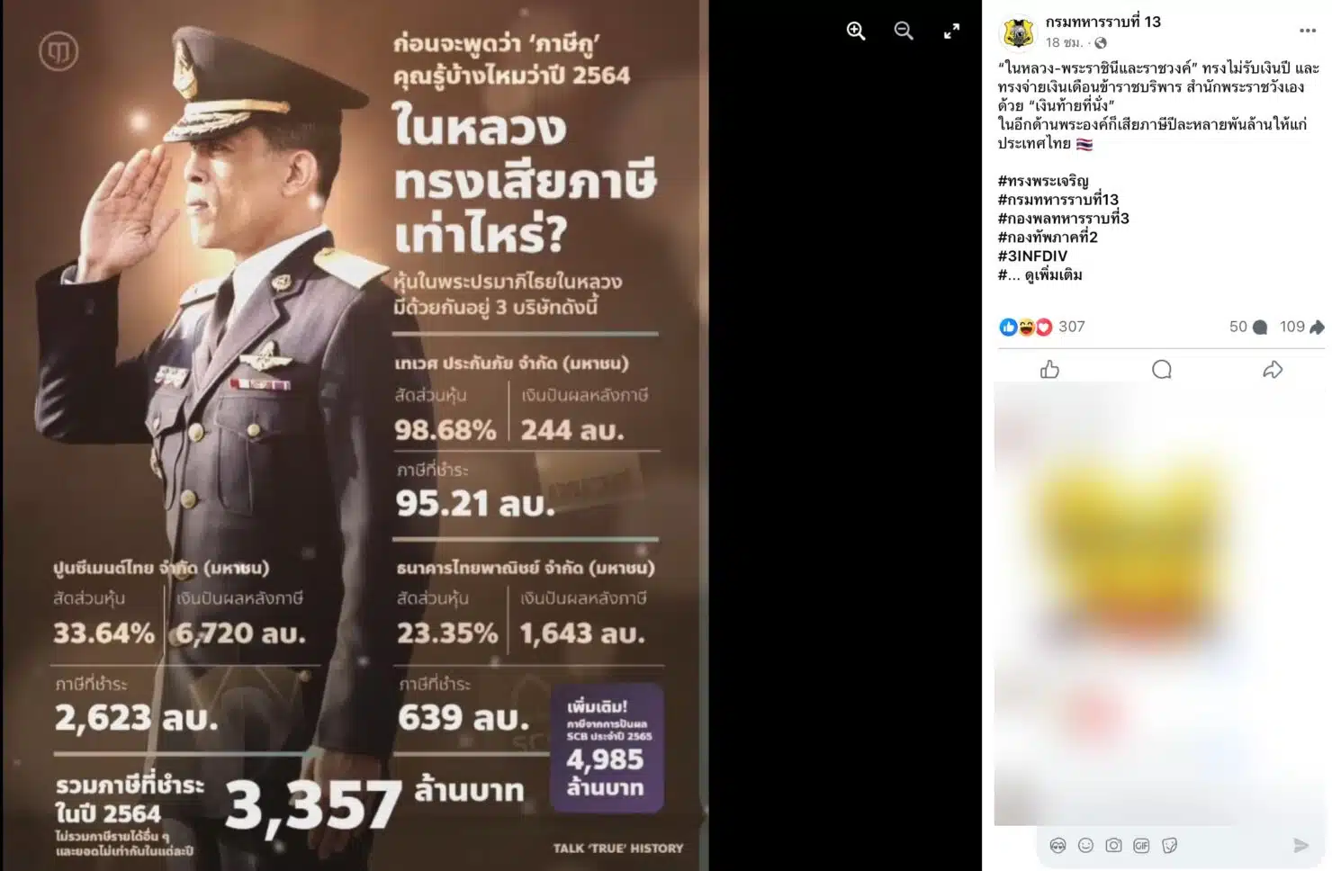 กรมทหารราบที่ 13 เผยแพร่ความรู้ ปี 2564 ใหลวง ทรงเสียภาษีจากเงินปันผลถือหุ้น มากถึง 3,357 ล้านบาท พร้อมทรงไม่รับเงินปี จ่ายเงินเดือนข้าราชบริพาร ด้วยเงินท้ายที่นั่ง