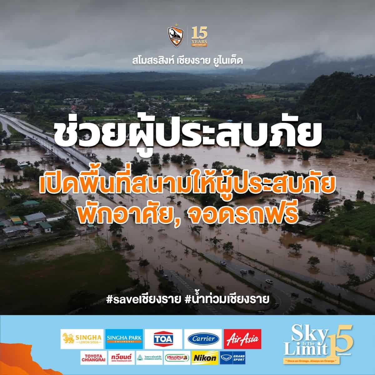 ล่าสุด ประธานฮั่น หรือ มิตติ ติยะไพรัช ประธานสโมสรเชียงราย ยูไนเต็ด ได้มีการโพสต์้ขอความผ่านเฟซบุ๊กว่า “สำหรับวันนี้ผู้ประสบภัยเร่งด่วนที่ไม่มีที่พัก ฟรี!!! ทางสโมสรมีห้องพักรวมไม่ได้แยกชายหญิง ฟรี!!! เปิดให้เข้าพักได้จำนวน 64 คน มีเตียง มีหมอน ผ้าห่ม มีห้องอาบน้ำ มีล้อคเกอร์ มีห้องน้ำ และเครื่องซักผ้า ไม่มีผ้าเช็ดตัว ตอนนี้พร้อมบริการแล้ว ฟรี!!! สามารถติดต่อสโมสรได้ที่เบอร์ 0631637494, 0624024188 #saveเชียงราย #น้ำท่วมเชียงราย”