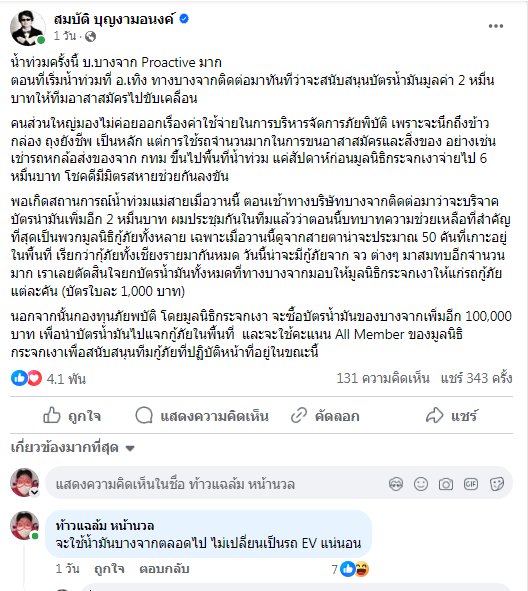 นายสมบัติ บุญงามอนงค์ หรือ บก.ลายจุด ได้โพสต์ข้อความผ่านเฟซบุ๊กส่วนตัวชื่นชมการช่วยเหลือของบริษัทบางจากที่ได้มอบบัตรเติมน้ำมันมูลค่า 20,000 บาทให้กับมูลนิธิกระจกเงา เพื่อนำไปแจกจ่ายให้กับรถกู้ภัยแต่ละคันที่กำลังปฏิบัติงานอยู่ในพื้นที่ประสบภัยน้ำท่วม