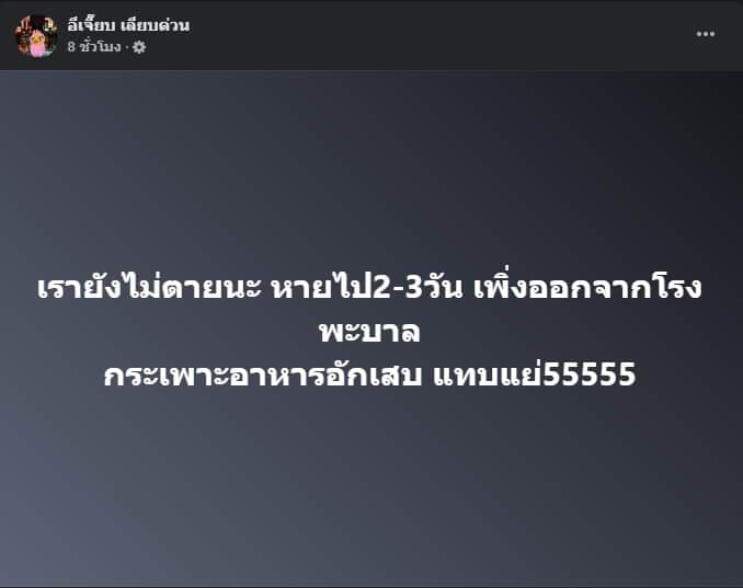 กลายเป็นชื่อที่ถูกพูดถึงอีกครั้ง สำหรับ อีเจี๊ยบ เลียบด่วน เพจเฟซบุ๊กที่มีผู้ติดตามกว่า 3.4 ล้านคน ได้กลับมาโพสต์ข้อความว่า “เรายังไม่ตายนะ หายไป2-3วัน เพิ่งออกจากโรงพะบาล กระเพาะอาหารอักเสบ แทบแย่55555” ทำเอาแฟนคลับที่ติดตามเป็นห่วงกันยกใหญ่