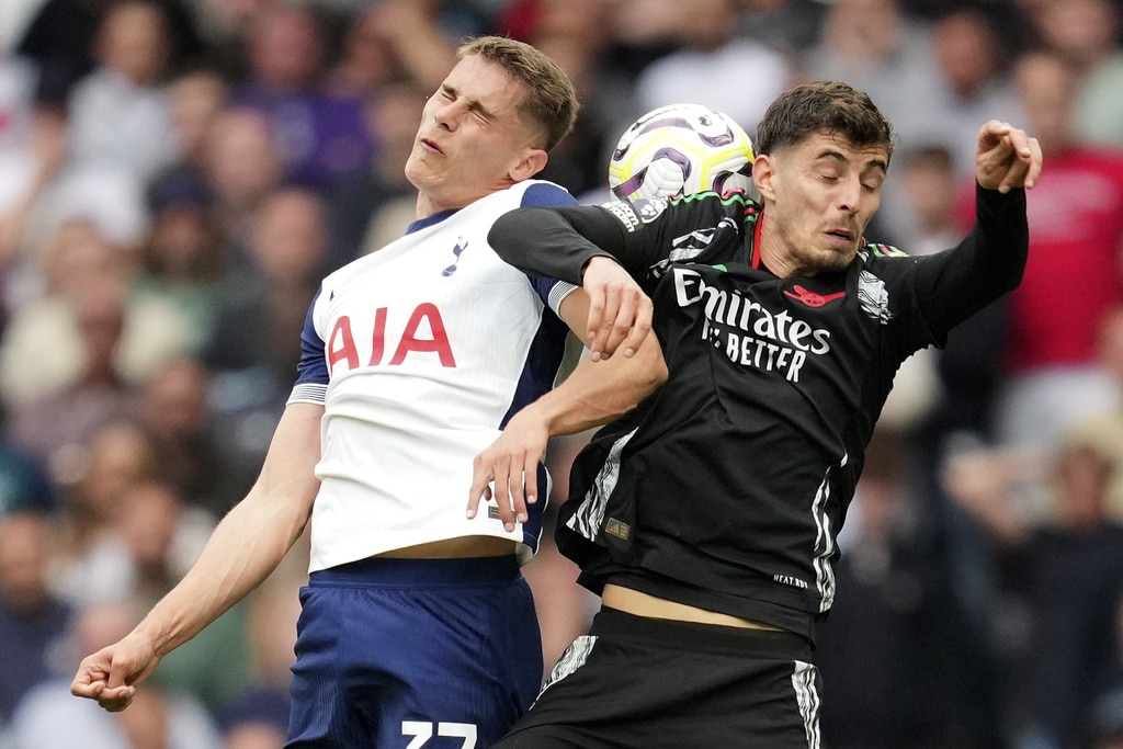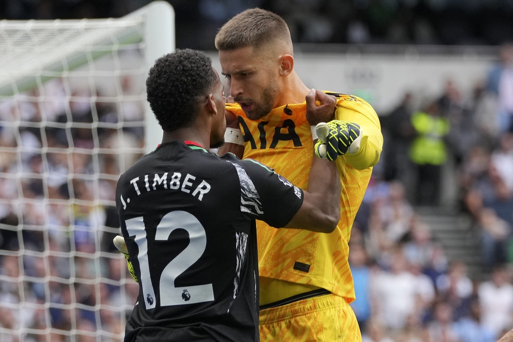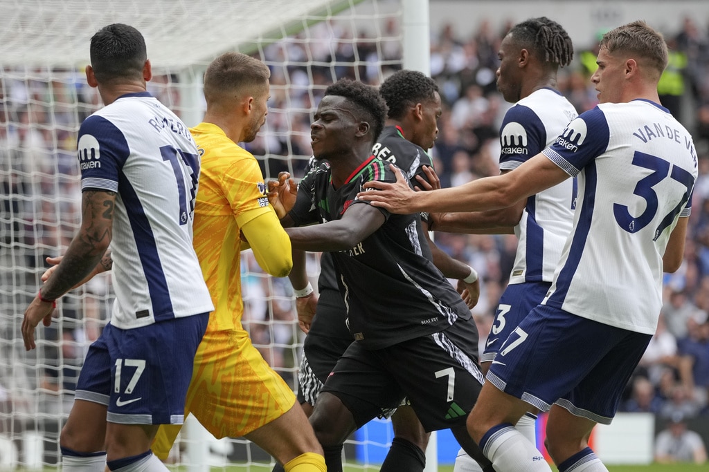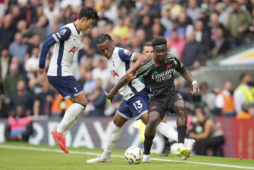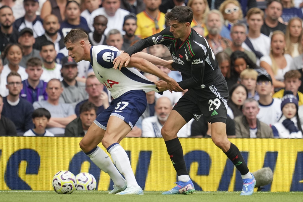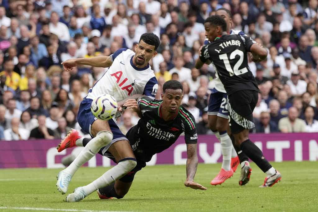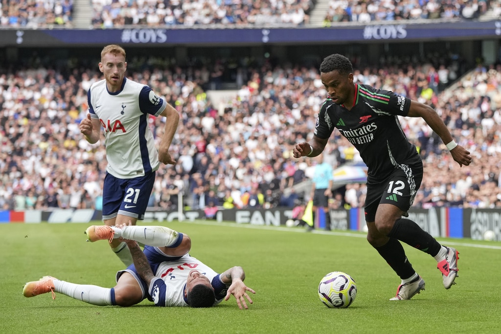 Arsenal’s Jurrien Timber, right, runs with the ball after a challenge with Tottenham’s Pedro Porro during the English Premier League soccer match between Tottenham Hotspur and Arsenal in London, Sunday, Sept. 15, 2024. (AP Photo/Kin Cheung)Arsenal’s Bukayo Saka, right, is challenged by Tottenham’s Son Heung-min, left, and Tottenham’s Destiny Udogie during the English Premier League soccer match between Tottenham Hotspur and Arsenal in London, Sunday, Sept. 15, 2024. (AP Photo/Kin Cheung)Arsenal’s manager Mikel Arteta celebrates with Arsenal’s goalkeeper David Raya after the English Premier League soccer match between Tottenham Hotspur and Arsenal in London, Sunday, Sept. 15, 2024. (AP Photo/Kin Cheung)Tottenham’s Micky van de Ven, left, and Arsenal’s Kai Havertz battle for the ball during the English Premier League soccer match between Tottenham Hotspur and Arsenal in London, Sunday, Sept. 15, 2024. (AP Photo/Kin Cheung)Tottenham’s Dominic Solanke, left, is challenged by Arsenal’s Gabriel during the English Premier League soccer match between Tottenham Hotspur and Arsenal in London, Sunday, Sept. 15, 2024. (AP Photo/Kin Cheung)Arsenal’s Gabriel, center, celebrates after scoring the opening goal during the English Premier League soccer match between Tottenham Hotspur and Arsenal in London, Sunday, Sept. 15, 2024. (John Walton/PA via AP)Arsenal’s Kai Havertz pulls the shirt of Tottenham’s Micky van de Ven during the English Premier League soccer match between Tottenham Hotspur and Arsenal in London, Sunday, Sept. 15, 2024. (AP Photo/Kin Cheung)Arsenal’s Bukayo Saka pushes Tottenham’s goalkeeper Guglielmo Vicario during the English Premier League soccer match between Tottenham Hotspur and Arsenal in London, Sunday, Sept. 15, 2024. (AP Photo/Kin Cheung)Arsenal’s Jurrien Timber and Tottenham’s goalkeeper Guglielmo Vicario square-up to each other during the English Premier League soccer match between Tottenham Hotspur and Arsenal in London, Sunday, Sept. 15, 2024. (AP Photo/Kin Cheung)