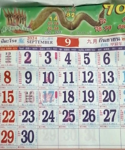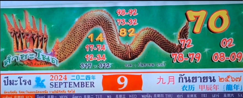 - เลขหัวปฏิทินคำชะโนด : 70 – 82 – 14 – 72 – 78 – 79 – 02 – 09 – 08 – 73 – 32 – 98 – 92 – 17 – 74 – 12 – 34