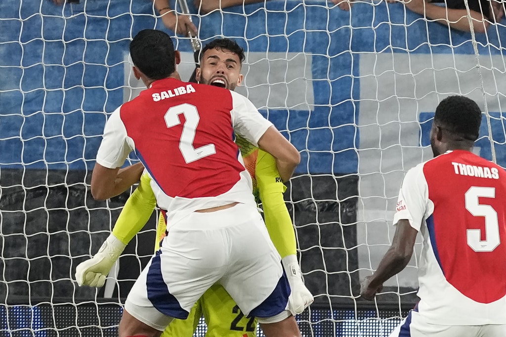 Arsenal’s goalkeeper David Raya reacts after saving on Atalanta’s Mateo Retegui penalty kick during the Champions League opening phase soccer match between Atalanta and Arsenal at the Bergamo’s stadium in Bergamo, Italy, Thursday, Sept. 19, 2024. (AP Photo/Antonio Calanni)