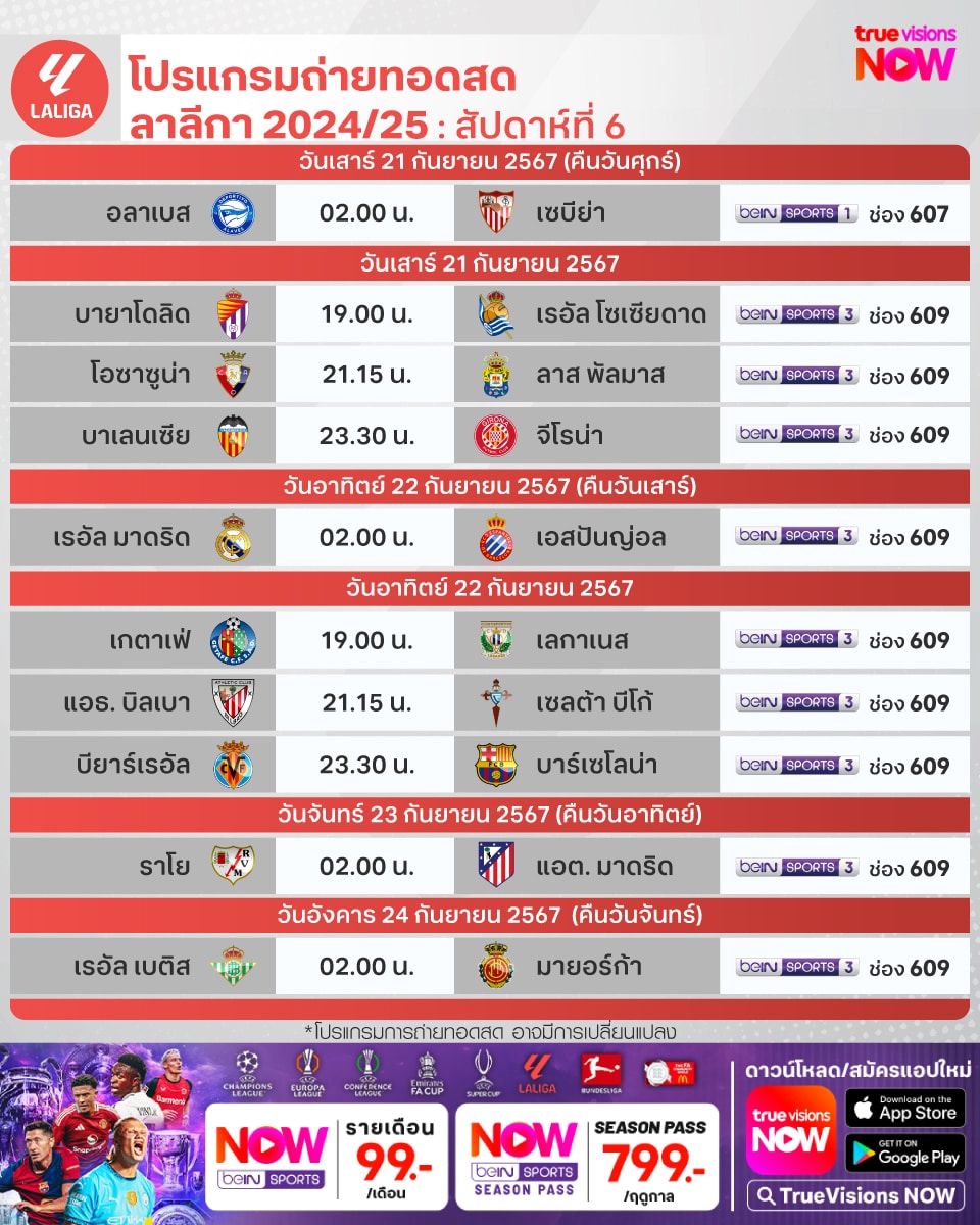 โปรแกรม ลาลีกา สเปน ประจำฤดูกาล 2024/25 สัปดาห์ที่ 6 ถ่ายทอดสดทางช่อง beIN Sport