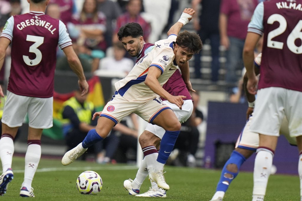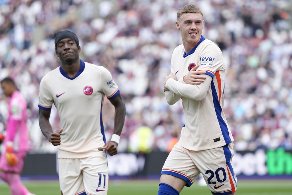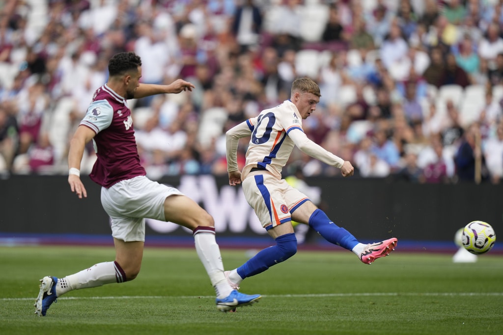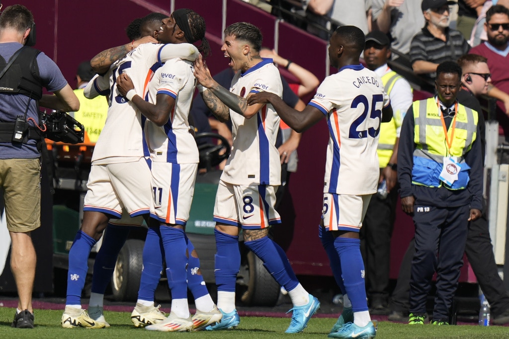 Chelsea’s Jadon Sancho, left, and West Ham’s Aaron Wan-Bissaka fight for the ball during the English Premier League soccer match between West Ham United and Chelsea at the London stadium in London, Saturday, Sept. 21, 2024. (AP Photo/Alastair Grant)Chelsea’s Joao Felix, front, and West Ham’s Carlos Soler fight for the ball during the English Premier League soccer match between West Ham United and Chelsea at the London stadium in London, Saturday, Sept. 21, 2024. (AP Photo/Alastair Grant)West Ham’s Aaron Cresswell holds Chelsea’s Axel Disai during the English Premier League soccer match between West Ham United and Chelsea at the London stadium in London, Saturday, Sept. 21, 2024. (AP Photo/Alastair Grant)Chelsea’s head coach Enzo Maresca reacts during the English Premier League soccer match between West Ham United and Chelsea at the London stadium in London, Saturday, Sept. 21, 2024. (AP Photo/Alastair Grant)Chelsea’s Cole Palmer scores during the English Premier League soccer match between West Ham United and Chelsea at the London stadium in London, Saturday, Sept. 21, 2024. (AP Photo/Alastair Grant)Chelsea’s Cole Palmer, right, celebrates after he scored during the English Premier League soccer match between West Ham United and Chelsea at the London stadium in London, Saturday, Sept. 21, 2024. (AP Photo/Alastair Grant)Chelsea’s Cole Palmer, right, celebrates after he scored during the English Premier League soccer match between West Ham United and Chelsea at the London stadium in London, Saturday, Sept. 21, 2024. (AP Photo/Alastair Grant)West Ham’s Mohammed Kudus reacts during the English Premier League soccer match between West Ham United and Chelsea at the London stadium in London, Saturday, Sept. 21, 2024. (AP Photo/Alastair Grant)West Ham’s Guido Rodriguez pulls Chelsea’s Nicolas Jackson during the English Premier League soccer match between West Ham United and Chelsea at the London stadium in London, Saturday, Sept. 21, 2024. (AP Photo/Alastair Grant)Chelsea players celebrate a goal during the English Premier League soccer match between West Ham United and Chelsea at the London stadium in London, Saturday, Sept. 21, 2024. (AP Photo/Alastair Grant)