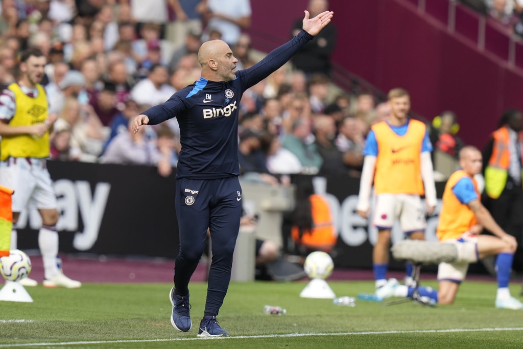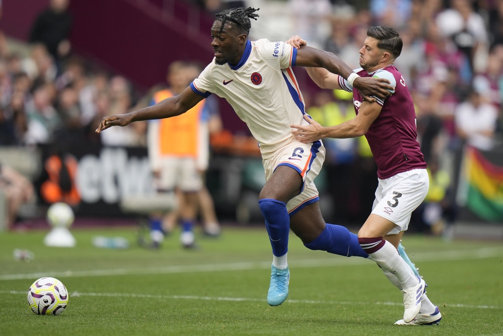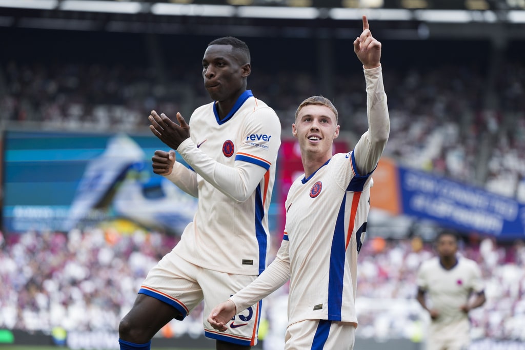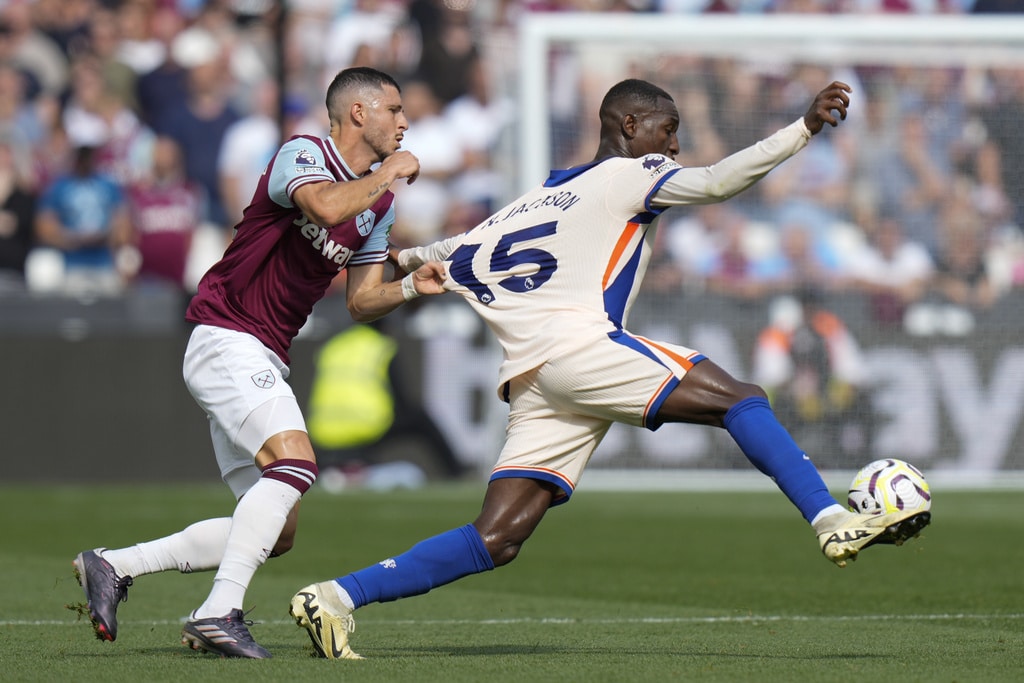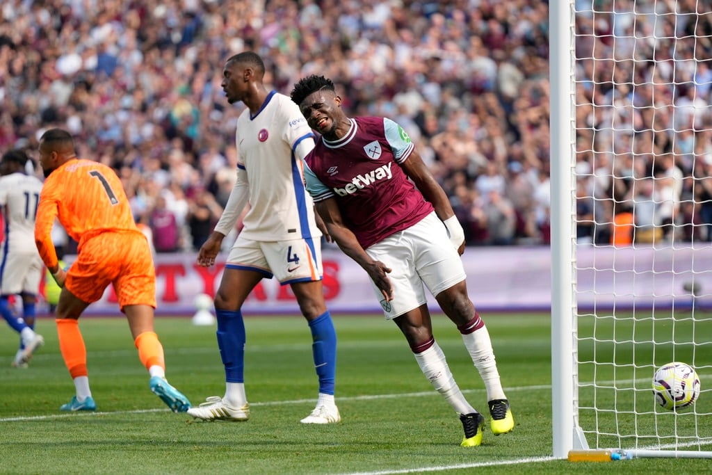 Chelsea’s Jadon Sancho, left, and West Ham’s Aaron Wan-Bissaka fight for the ball during the English Premier League soccer match between West Ham United and Chelsea at the London stadium in London, Saturday, Sept. 21, 2024. (AP Photo/Alastair Grant)Chelsea’s Joao Felix, front, and West Ham’s Carlos Soler fight for the ball during the English Premier League soccer match between West Ham United and Chelsea at the London stadium in London, Saturday, Sept. 21, 2024. (AP Photo/Alastair Grant)West Ham’s Aaron Cresswell holds Chelsea’s Axel Disai during the English Premier League soccer match between West Ham United and Chelsea at the London stadium in London, Saturday, Sept. 21, 2024. (AP Photo/Alastair Grant)Chelsea’s head coach Enzo Maresca reacts during the English Premier League soccer match between West Ham United and Chelsea at the London stadium in London, Saturday, Sept. 21, 2024. (AP Photo/Alastair Grant)Chelsea’s Cole Palmer scores during the English Premier League soccer match between West Ham United and Chelsea at the London stadium in London, Saturday, Sept. 21, 2024. (AP Photo/Alastair Grant)Chelsea’s Cole Palmer, right, celebrates after he scored during the English Premier League soccer match between West Ham United and Chelsea at the London stadium in London, Saturday, Sept. 21, 2024. (AP Photo/Alastair Grant)Chelsea’s Cole Palmer, right, celebrates after he scored during the English Premier League soccer match between West Ham United and Chelsea at the London stadium in London, Saturday, Sept. 21, 2024. (AP Photo/Alastair Grant)West Ham’s Mohammed Kudus reacts during the English Premier League soccer match between West Ham United and Chelsea at the London stadium in London, Saturday, Sept. 21, 2024. (AP Photo/Alastair Grant)West Ham’s Guido Rodriguez pulls Chelsea’s Nicolas Jackson during the English Premier League soccer match between West Ham United and Chelsea at the London stadium in London, Saturday, Sept. 21, 2024. (AP Photo/Alastair Grant)Chelsea players celebrate a goal during the English Premier League soccer match between West Ham United and Chelsea at the London stadium in London, Saturday, Sept. 21, 2024. (AP Photo/Alastair Grant)