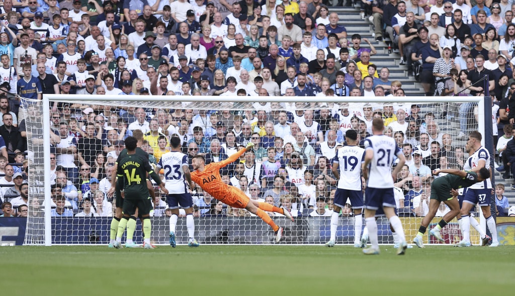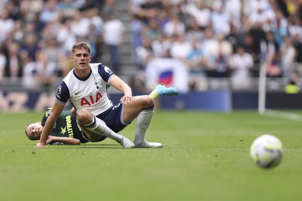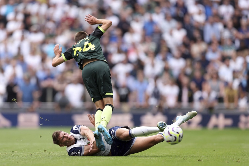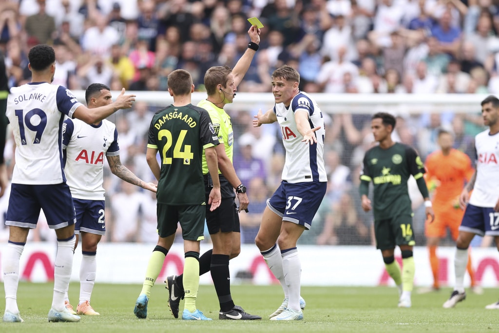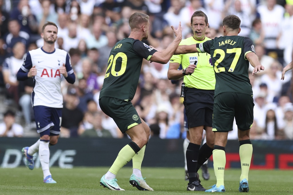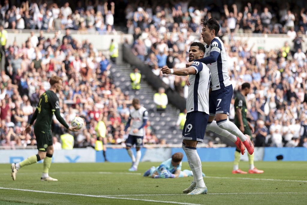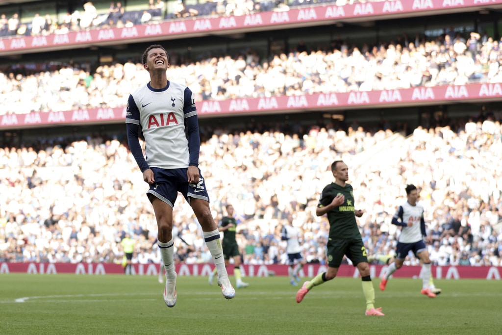 Tottenham Hotspur’s Dominic Solanke, second right, celebrates scoring his side’s first goal of the game with teammate Son Heung-Min, during the English Premier League soccer match between Tottenham Hotspur and Brentford, at the Tottenham Hotspur Stadium, in London, Saturday, Sept. 21, 2024. (Steven Paston/PA via AP)Tottenham Hotspur’s Brennan Johnson reacts after a missed opportunity to score, during the English Premier League soccer match between Tottenham Hotspur and Brentford, at the Tottenham Hotspur Stadium, in London, Saturday, Sept. 21, 2024. (Steven Paston/PA via AP)Brentford’s Kevin Schade, right, heads the the ball towards goal saved by Tottenham Hotspur goalkeeper Guglielmo Vicario (centre), during the English Premier League soccer match between Tottenham Hotspur and Brentford, at the Tottenham Hotspur Stadium, in London, Saturday, Sept. 21, 2024. (Steven Paston/PA via AP)Brentford’s Kristoffer Ajer, center, appeals the referee, during the English Premier League soccer match between Tottenham Hotspur and Brentford, at the Tottenham Hotspur Stadium, in London, Saturday, Sept. 21, 2024. (Steven Paston/PA via AP)Referee John Brooks, center, shows Tottenham Hotspur’s Micky van de Ven, right, a yellow card , during the English Premier League soccer match between Tottenham Hotspur and Brentford, at the Tottenham Hotspur Stadium, in London, Saturday, Sept. 21, 2024. (Steven Paston/PA via AP)Tottenham Hotspur’s Son Heung-Min controls the ball, during the English Premier League soccer match between Tottenham Hotspur and Brentford, at the Tottenham Hotspur Stadium, in London, Saturday, Sept. 21, 2024. (Steven Paston/PA via AP)Tottenham Hotspur’s Micky van de Ven, on pitch and Brentford’s Mikkel Damsgaard vie for the ball, during the English Premier League soccer match between Tottenham Hotspur and Brentford, at the Tottenham Hotspur Stadium, in London, Saturday, Sept. 21, 2024. (Steven Paston/PA via AP)Tottenham Hotspur’s Micky van de Ven, foreground and Brentford’s Mikkel Damsgaard vie for the ball, during the English Premier League soccer match between Tottenham Hotspur and Brentford, at the Tottenham Hotspur Stadium, in London, Saturday, Sept. 21, 2024. (Steven Paston/PA via AP)