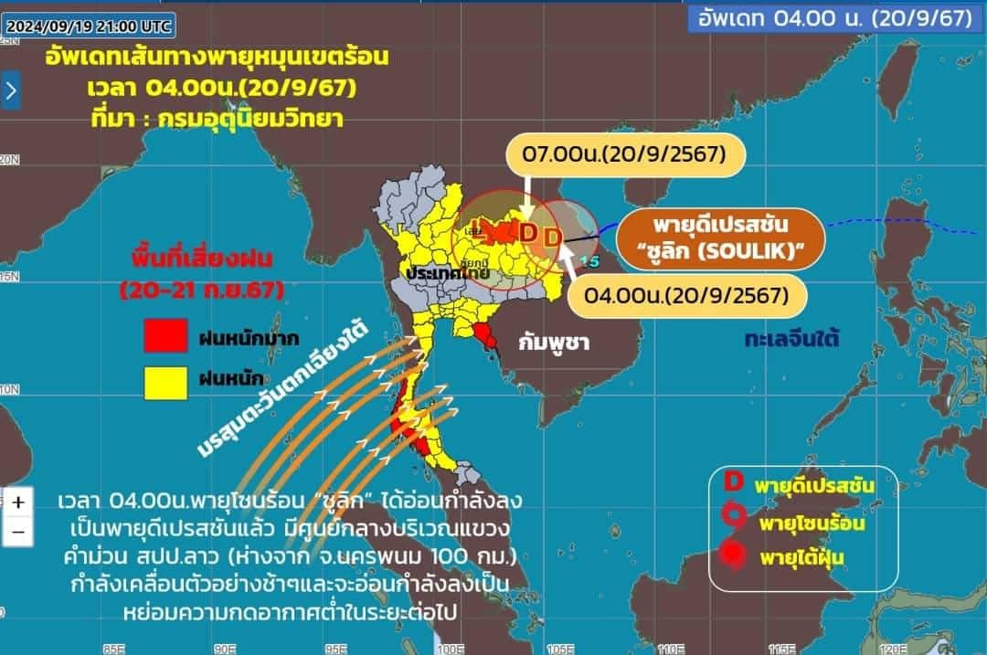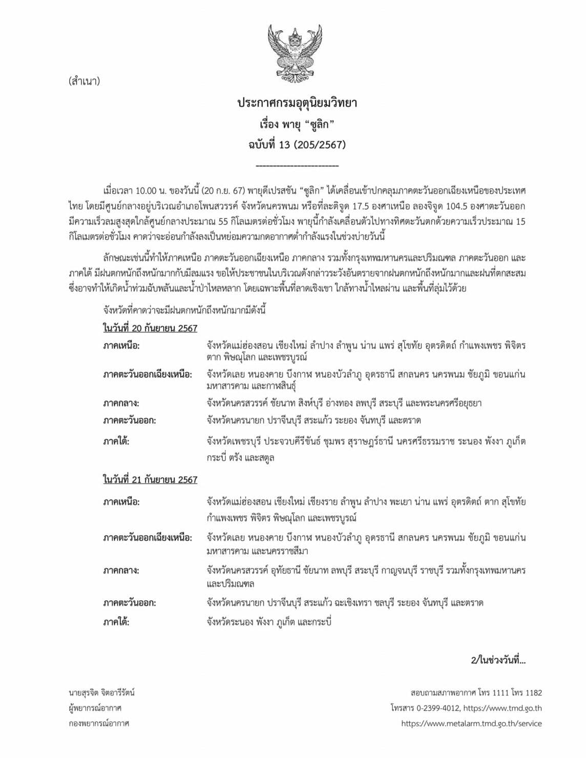 เมื่อเวลา 10.00 น. วันที่ 20 ก.ย.2567 กรมอุตุนิยมวิทยา ประกาศเตือนภัย เรื่อง พายุ “ซูลิก” ฉบับที่ 13 (205/2567) โดยระบุว่า พายุดีเปรสชัน “ซูลิก” ได้เคลื่อนเข้าปกคลุมภาคตะวันออกเฉียงเหนือของประเทศไทย โดยมีศูนย์กลางอยู่บริเวณอำเภอโพนสวรรค์ จังหวัดนครพนม หรือที่ละติจูด 17.5 องศาเหนือ ลองจิจูด 104.5 องศาตะวันออก