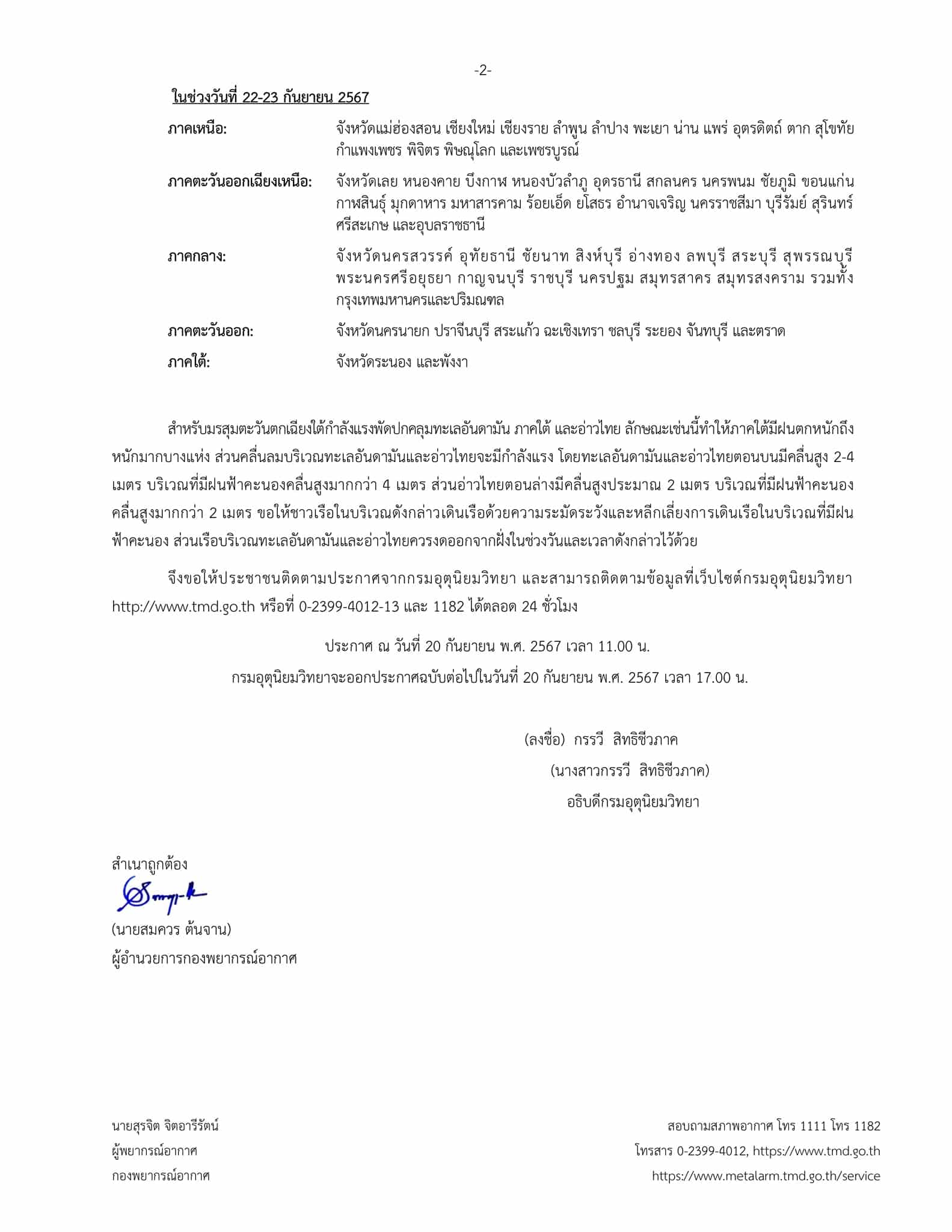 จึงขอให้ประชาชนติดตามประกาศจากกรมอุตุนิยมวิทยา และสามารถติดตามข้อมูลที่เว็บไซต์กรมอุตุนิยมวิทยา http://www.tmd.go.th หรือที่ 0-2399-4012-13 และ 1182 ได้ตลอด 24 ชั่วโมง ประกาศ ณ วันที่ 20 กันยายน พ.ศ. 2567 เวลา 11.00 น. กรมอุตุนิยมวิทยาจะออกประกาศฉบับต่อไปในวันที่ 20 กันยายน พ.ศ. 2567 เวลา 17.00 น.