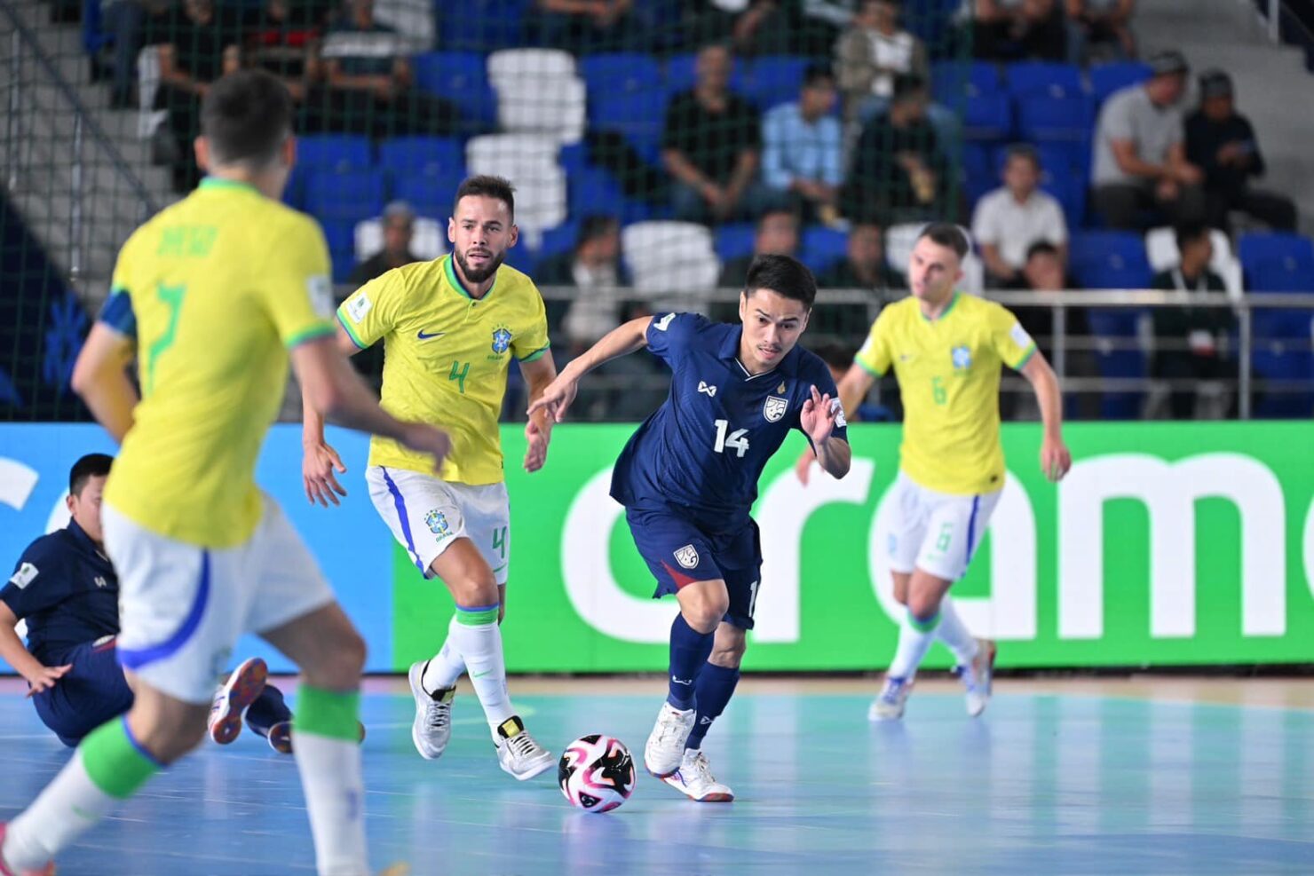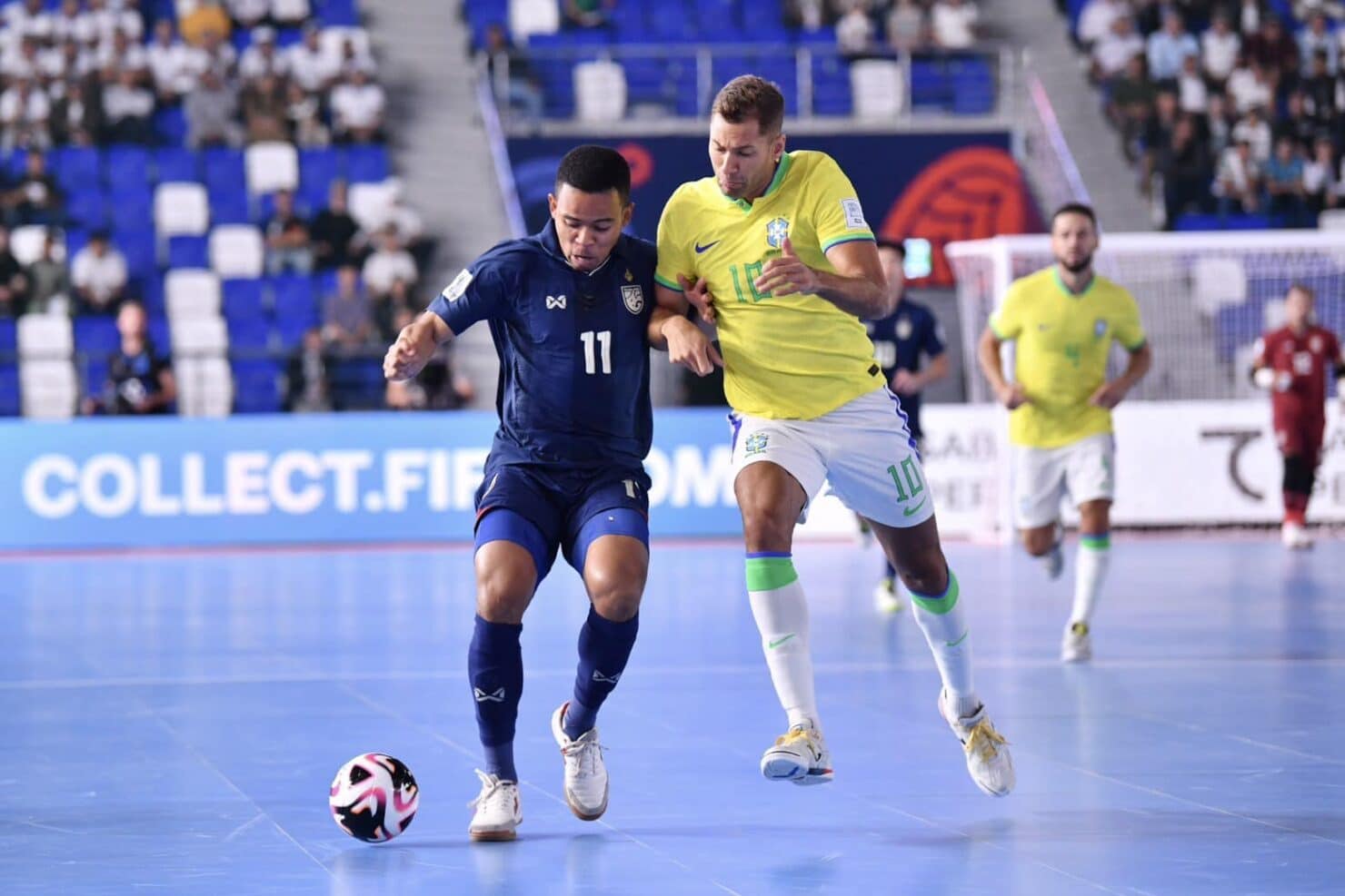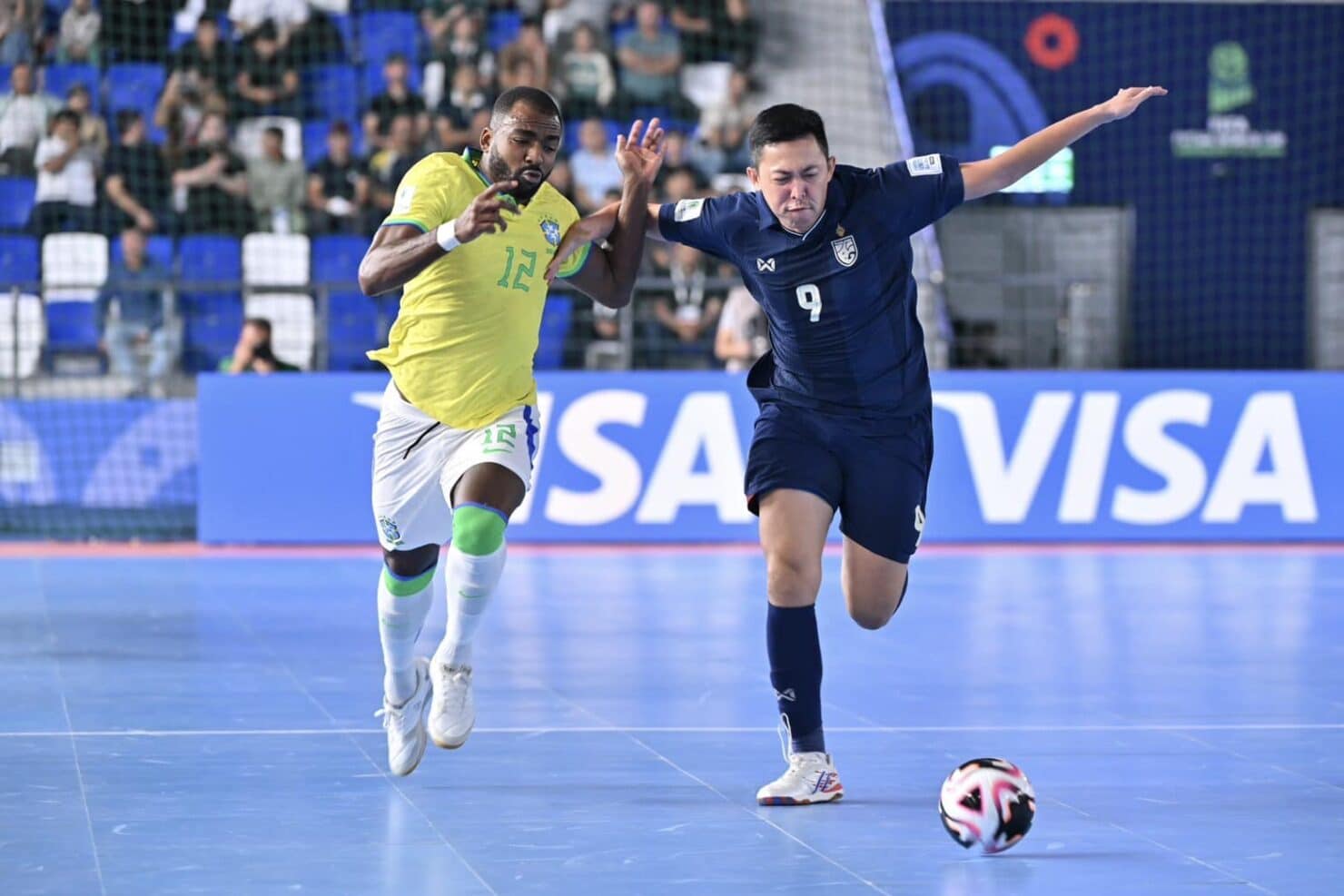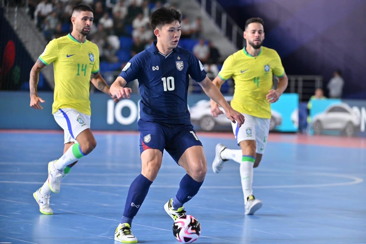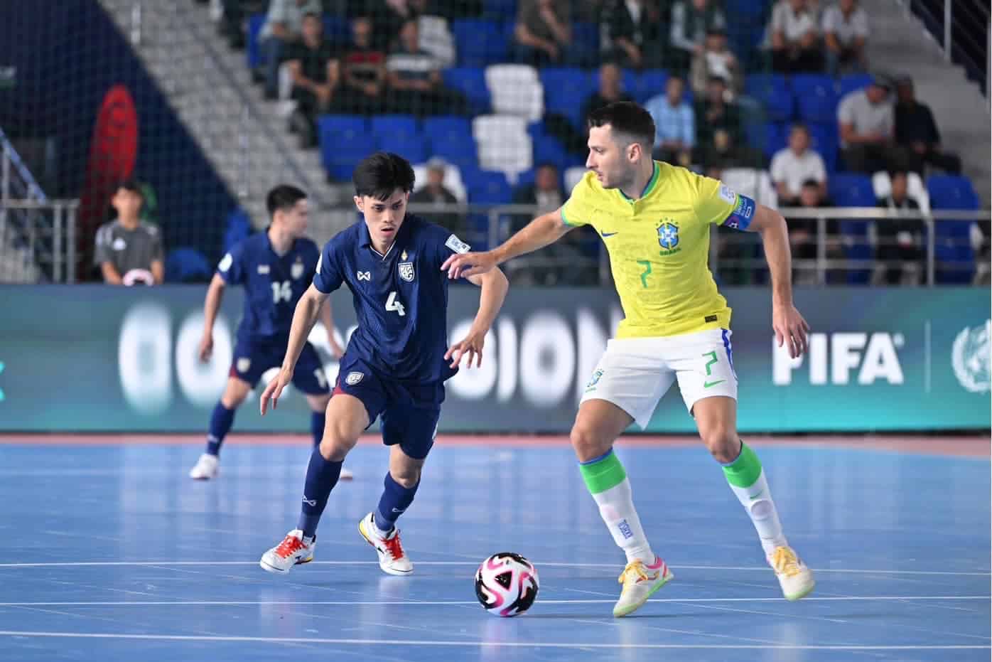 นาทีที่ 11 ฟุตซอลไทย มีโอกาสลุ้นประตูตีไข่แตก จากจังหวะยิงด้วยขวาของ สราวุท ผลาพฤกษ์ บอลไปติดเซฟ วิลเลียม ผู้รักษาประตูบราซิลปัดเอาไว้ได้