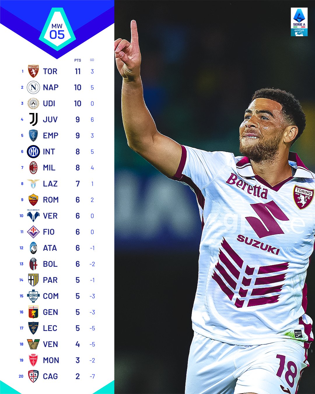 สรุปผลการแข่งขัน กัลโช่ เซเรียอา 2024/25 หลังจบนัดที่ 5