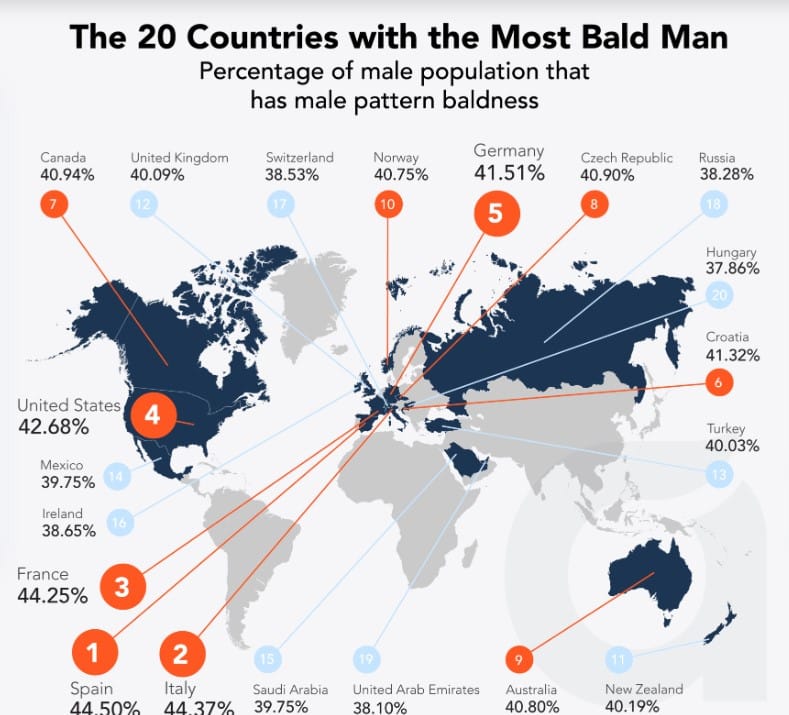 ชายไทยไม่ต้องน้อยใจไป เพราะหากวัดอันดับกันในกลุ่มตัวอย่างนั้น ประเทศไทยถูกจัดอยู่อันดับที่ 40 จากทั้งหมด 47 ประเทศ ห่างจากท็อป 3 อย่าง สเปน (44.50%), อิตาลี (44.37%), ฝรั่งเศส (44.25%) อีกเยอะ ซึ่งส่วนใหญ่กลุ่มประเทศที่ผู้ชายหัวล้านจะเป็นฝั่งตะวันตกเสียส่วนใหญ่