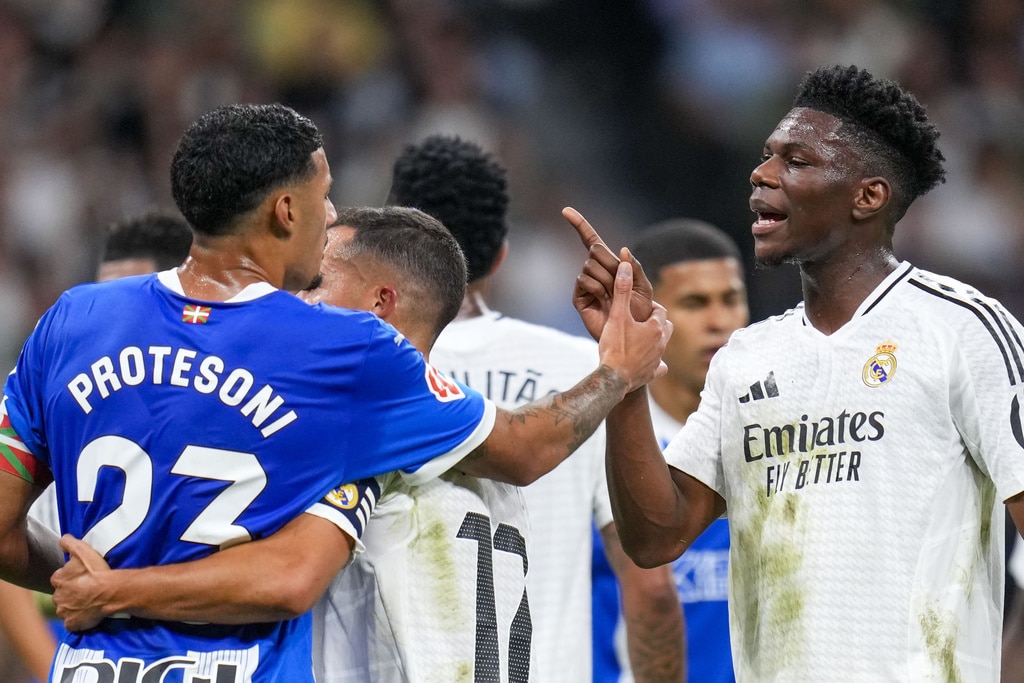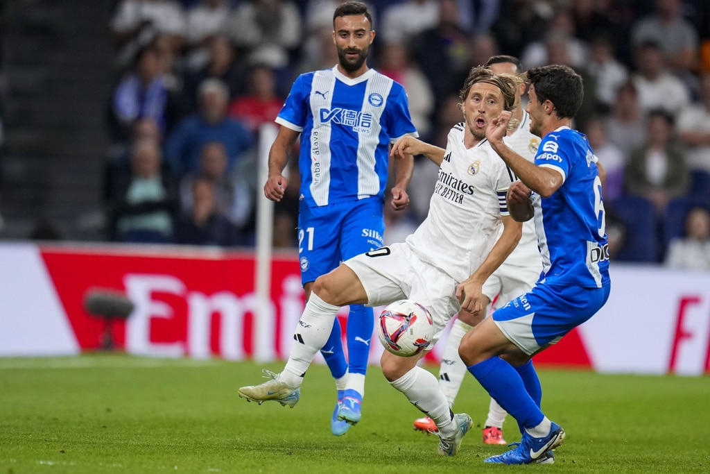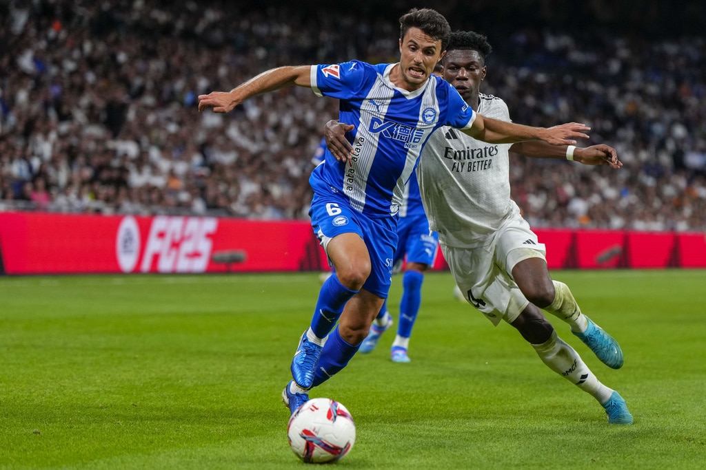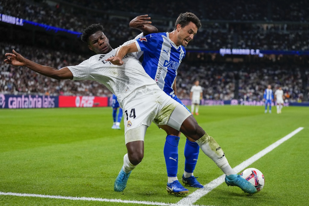 Real Madrid’s Vinicius Junior, right, duels for the ball with Alaves’ Antonio Blanco during a Spanish La Liga soccer match between Real Madrid and Alaves at Santiago Bernabeu stadium in Madrid, Spain, Tuesday, Sept. 24, 2024. (AP Photo/Manu Fernandez)Real Madrid’s Aurelien Tchouameni, right, duels for the ball with Alaves’ Ander Guevara during a Spanish La Liga soccer match between Real Madrid and Alaves at Santiago Bernabeu stadium in Madrid, Spain, Tuesday, Sept. 24, 2024. (AP Photo/Manu Fernandez)Real Madrid’s Aurelien Tchouameni, front, duels for the ball with Alaves’ Ander Guevara during a Spanish La Liga soccer match between Real Madrid and Alaves at Santiago Bernabeu stadium in Madrid, Spain, Tuesday, Sept. 24, 2024. (AP Photo/Manu Fernandez)Real Madrid’s Luka Modric, center, duels for the ball with Alaves’ Ander Guevara, right, during a Spanish La Liga soccer match between Real Madrid and Alaves at Santiago Bernabeu stadium in Madrid, Spain, Tuesday, Sept. 24, 2024. (AP Photo/Manu Fernandez)Alaves’ Manu Sanchez, left, duels for the ball with Real Madrid’s Jude Bellingham during a Spanish La Liga soccer match between Real Madrid and Alaves at Santiago Bernabeu stadium in Madrid, Spain, Tuesday, Sept. 24, 2024. (AP Photo/Manu Fernandez)Real Madrid’s Lucas Vazquez, center, duels for the ball with Alaves’ Antonio Blanco, right, and Alaves’ Manu Sanchez during a Spanish La Liga soccer match between Real Madrid and Alaves at Santiago Bernabeu stadium in Madrid, Spain, Tuesday, Sept. 24, 2024. (AP Photo/Manu Fernandez)Real Madrid’s David Alaba, right, discusses with Alaves’ Carlos Benavidez during a Spanish La Liga soccer match between Real Madrid and Alaves at Santiago Bernabeu stadium in Madrid, Spain, Tuesday, Sept. 24, 2024. (AP Photo/Manu Fernandez)