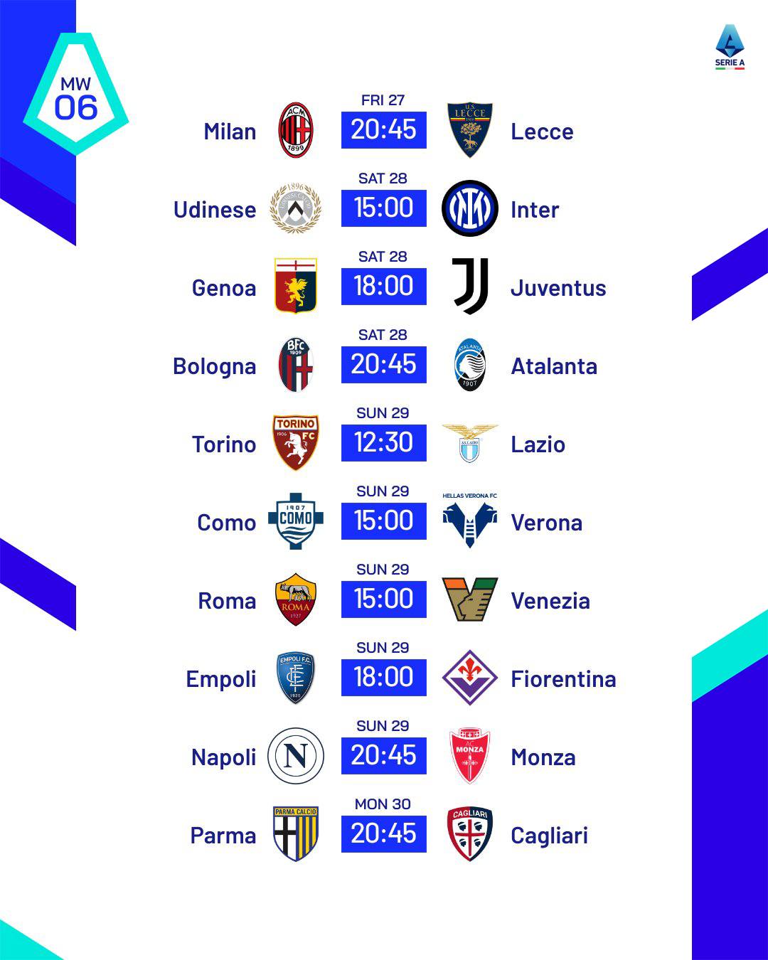 โปรแกรม กัลโช่ เซเรีย อา ประจำฤดูกาล 2024/25 สัปดาห์ที่ 6 ทุกคู่ (เวลาไทย)