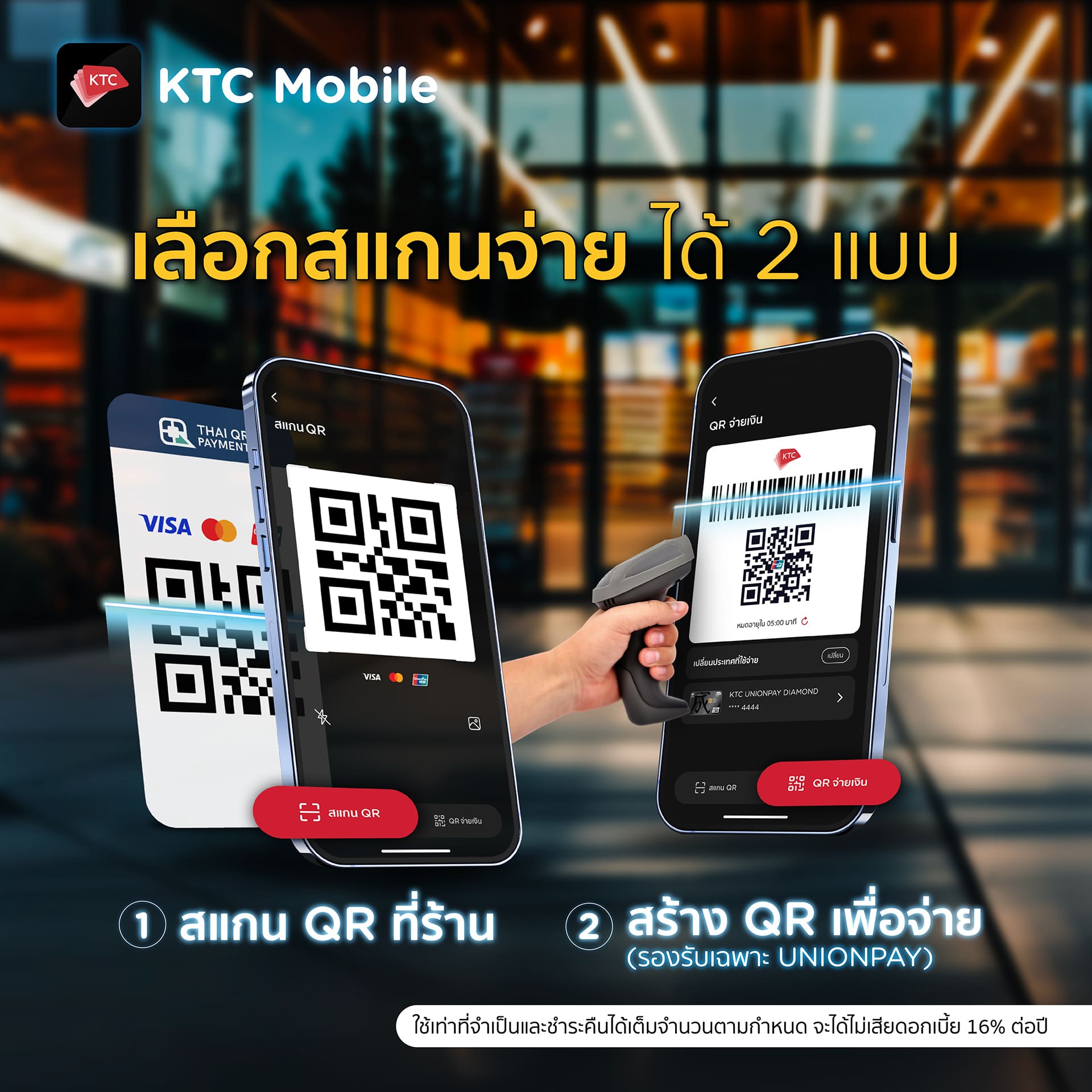 หากคุณสงสัยว่า บัตรเครดิต สแกนจ่ายได้ไหม? คำตอบก็คือ “สามารถทำได้” เพียง สมัครบัตรเครดิต KTC VISA, KTC MASTERCARD และ KTC UNIONPAY ทุกประเภท หลังได้รับการอนุมัติบัตรเครดิต และลงทะเบียนการใช้งานผ่านแอป KTC Mobile แล้ว จะสามารถชำระได้ 2 รูปแบบ คือ 1. สแกน QR ที่ร้านค้า (รองรับ Visa, Mastercard, UnionPay) กับ 2. สร้าง QR เพื่อจ่ายให้ร้านค้าสแกน (รองรับเฉพาะ UnionPay)