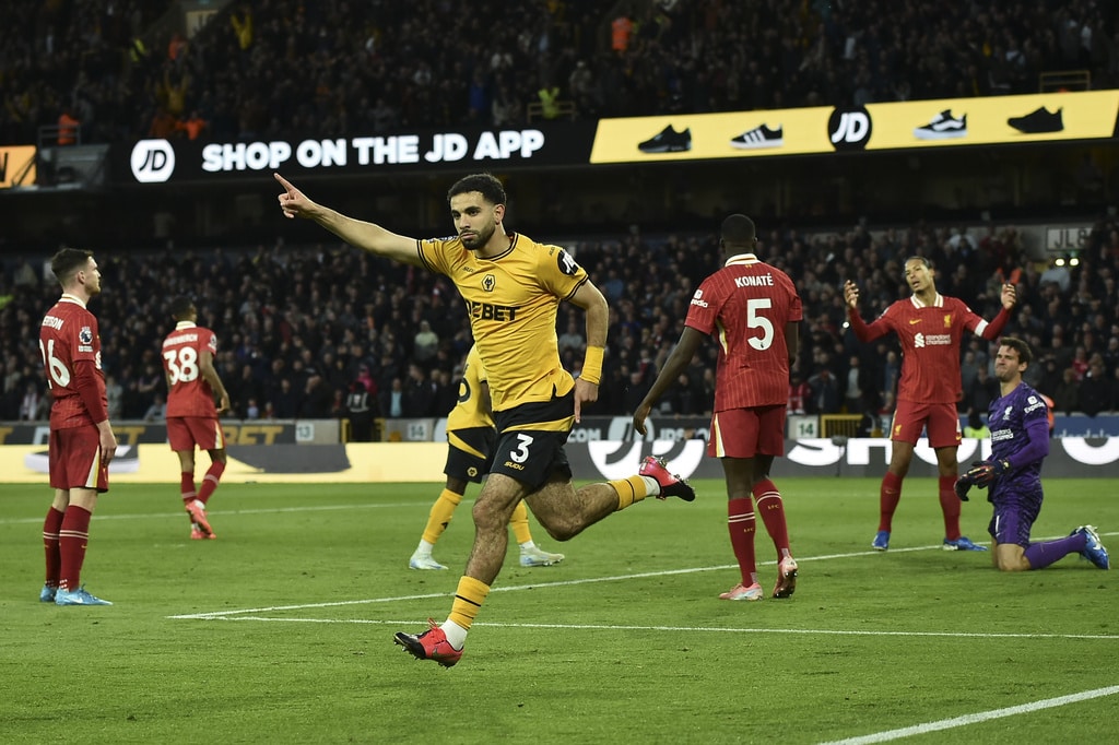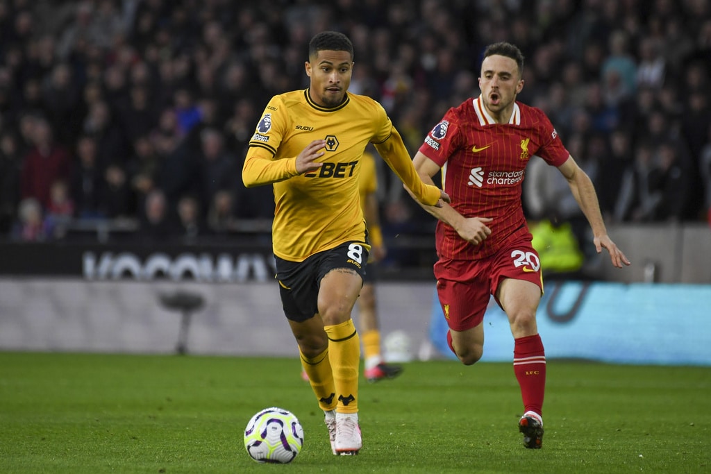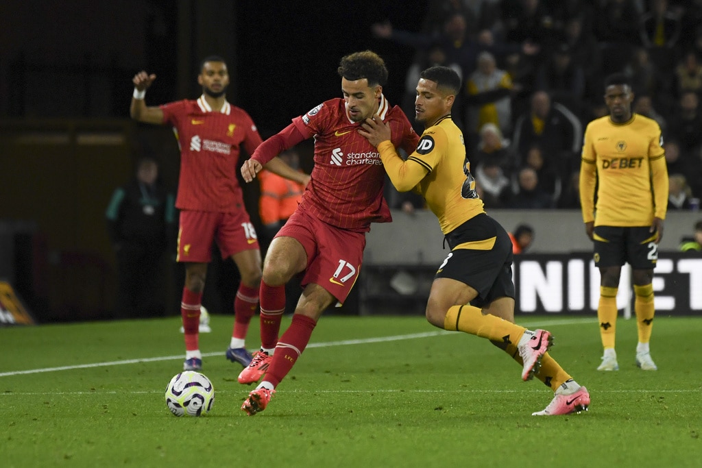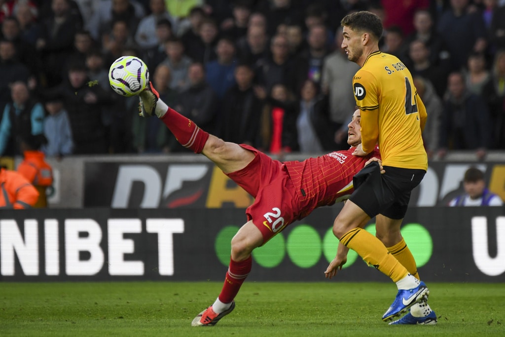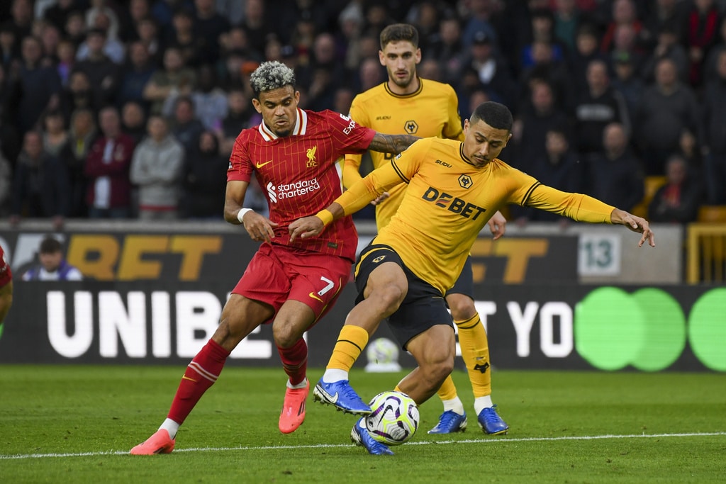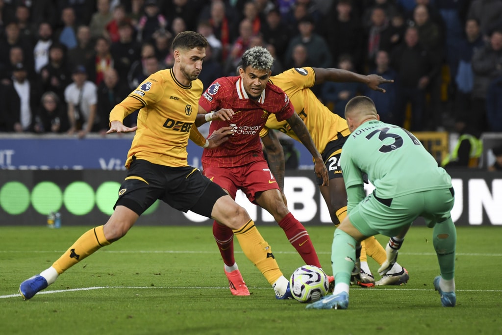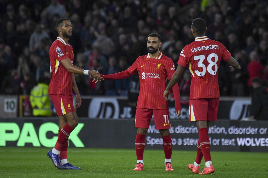 Liverpool’s Diogo Jota, back, kicks the ball challenged by Wolverhampton Wanderers’ Santiago Bueno during the English Premier League soccer match between Wolverhampton Wanderers and Liverpool at the Molineux Stadium in Wolverhampton, England, Saturday, Sept. 28, 2024. (AP Photo/Rui Vieira)Liverpool’s Cody Gakpo, left, Mohamed Salah, center, and Ryan Gravenberch celebrate their team victory at the end of the English Premier League soccer match between Wolverhampton Wanderers and Liverpool at the Molineux Stadium in Wolverhampton, England, Saturday, Sept. 28, 2024. (AP Photo/Rui Vieira)Wolverhampton Wanderers’ Joao Gomes, left, and Liverpool’s Curtis Jones vie for the ball during the English Premier League soccer match between Wolverhampton Wanderers and Liverpool at the Molineux Stadium in Wolverhampton, England, Saturday, Sept. 28, 2024. (AP Photo/Rui Vieira)Wolverhampton Wanderers’ Hwang Hee-chan reacts during the English Premier League soccer match between Wolverhampton Wanderers and Liverpool at the Molineux Stadium in Wolverhampton, England, Saturday, Sept. 28, 2024. (AP Photo/Rui Vieira)Wolverhampton Wanderers’ Joao Gomes, center, is chased by Liverpool’s Diogo Jota during the English Premier League soccer match between Wolverhampton Wanderers and Liverpool at the Molineux Stadium in Wolverhampton, England, Saturday, Sept. 28, 2024. (AP Photo/Rui Vieira)Wolverhampton Wanderers’ Rayan Ait-Nouri celebrates scoring his side’s first goal during the English Premier League soccer match between Wolverhampton Wanderers and Liverpool at the Molineux Stadium in Wolverhampton, England, Saturday, Sept. 28, 2024. (AP Photo/Rui Vieira)Liverpool’s Mohamed Salah celebrates scoring his side’s second goal of the game during the English Premier League soccer match between Wolverhampton Wanderers and Liverpool at the Molineux Stadium in Wolverhampton, England, Saturday, Sept. 28, 2024. (Nick Potts/PA via AP)Liverpool’s Luis Diaz, center, vies for the ball against Wolverhampton Wanderers’ Santiago Bueno, left, and goalkeeper Sam Johnstone during the English Premier League soccer match between Wolverhampton Wanderers and Liverpool at the Molineux Stadium in Wolverhampton, England, Saturday, Sept. 28, 2024. (AP Photo/Rui Vieira)Liverpool’s Luis Diaz, left, and Wolverhampton Wanderers’ Andre compete for the ball during the English Premier League soccer match between Wolverhampton Wanderers and Liverpool at the Molineux Stadium in Wolverhampton, England, Saturday, Sept. 28, 2024. (AP Photo/Rui Vieira)