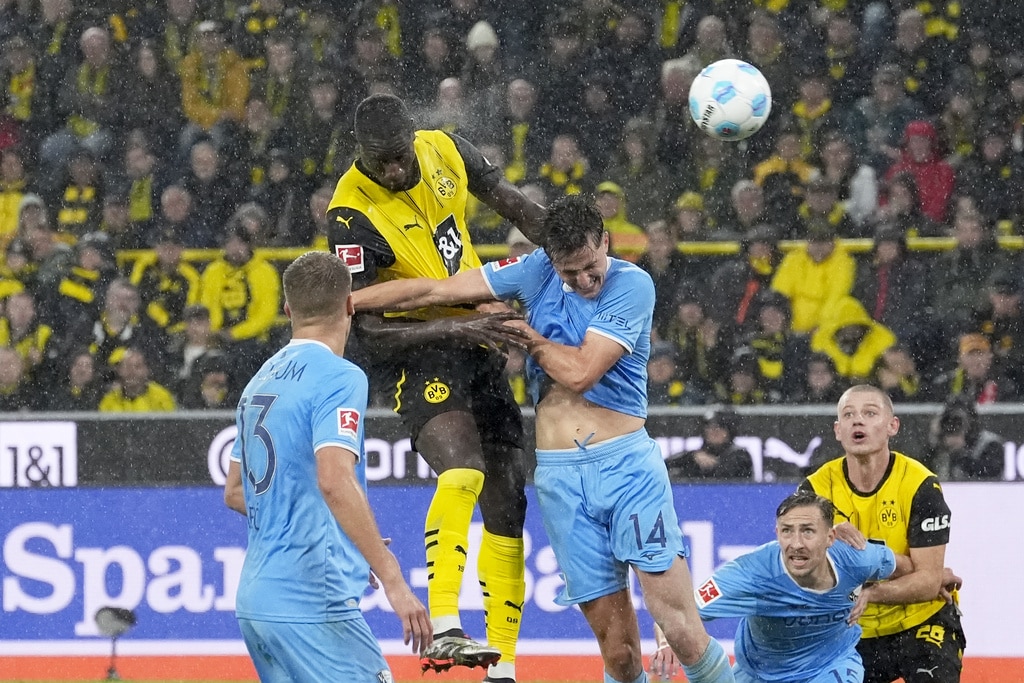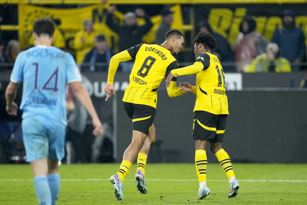 Bochum players celebrate after Matus Bero scored the opening goal during the German Bundesliga soccer match between Borussia Dortmund and VfL Bochum at Westfalenstadion in Dortmund, Germany, Friday, Sept. 27, 2024. (AP PhotoMartin Meissner)Bochum’s Dani de Wit jumps for the ball with Dortmund’s Nico Schlotterbeck, background, during the German Bundesliga soccer match between Borussia Dortmund and VfL Bochum at Westfalenstadion in Dortmund, Germany, Friday, Sept. 27, 2024. (AP PhotoMartin Meissner)Dortmund’s Felix Nmecha, center, celebrates with Julien Duranville after scoring his side’s fourth goal during the German Bundesliga soccer match between Borussia Dortmund and VfL Bochum at Westfalenstadion in Dortmund, Germany, Friday, Sept. 27, 2024. (AP PhotoMartin Meissner)Dortmund’s Serhou Yadaly Guirassi, center, celebrates with Karim Adeyemi, 2nd left, and Emre Can, right, after scoring his side’s third goal during the German Bundesliga soccer match between Borussia Dortmund and VfL Bochum at Westfalenstadion in Dortmund, Germany, Friday, Sept. 27, 2024. (AP PhotoMartin Meissner)Dortmund’s Waldemar Anton, left, fights for the ball with Bochum’s Philipp Hofmann during the German Bundesliga soccer match between Borussia Dortmund and VfL Bochum at Westfalenstadion in Dortmund, Germany, Friday, Sept. 27, 2024. (AP PhotoMartin Meissner)Bochum’s Myron Boadu jumps for the ball with Dortmund’s Waldemar Anton, background, during the German Bundesliga soccer match between Borussia Dortmund and VfL Bochum at Westfalenstadion in Dortmund, Germany, Friday, Sept. 27, 2024. (AP PhotoMartin Meissner)Dortmund’s Julian Brandt reacts after failing to score during the German Bundesliga soccer match between Borussia Dortmund and VfL Bochum at Westfalenstadion in Dortmund, Germany, Friday, Sept. 27, 2024. (AP PhotoMartin Meissner)Dortmund’s Serhou Yadaly Guirassi, 2nd left, jumps higher than Bochum’s Tim Oermann to score his side’s first goal during the German Bundesliga soccer match between Borussia Dortmund and VfL Bochum at Westfalenstadion in Dortmund, Germany, Friday, Sept. 27, 2024. (AP PhotoMartin Meissner)