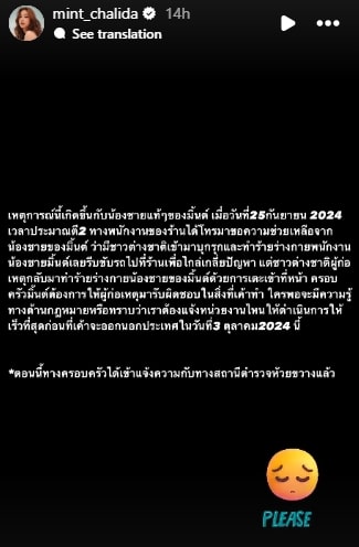 เมื่อวันที่ 27 กันยายน 2567 นางเอกสาวได้โพสต์เล่าเรื่องราวคร่าว ๆ พร้อมขอความช่วยเหลือผ่านทางอินสตาแกรมส่วนตัว mint_chalida ระบุว่า