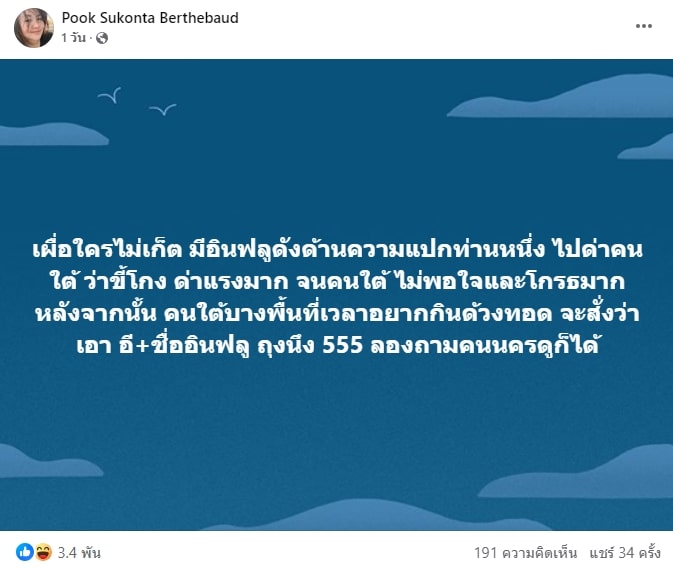 “เผื่อใครไม่เก็ต มีอินฟลูดังด้านความแปกท่านหนึ่ง ไปด่าคนใต้ ว่าขี้โกง ด่าแรงมาก จนคนใต้ ไม่พอใจและโกรธมากหลังจากนั้น คนใต้บางพื้นที่เวลาอยากกินด้วงทอด จะสั่งว่าเอา อี+ชื่ออินฟลู ถุงนึง 555 ลองถามคนนครดูก็ได้”