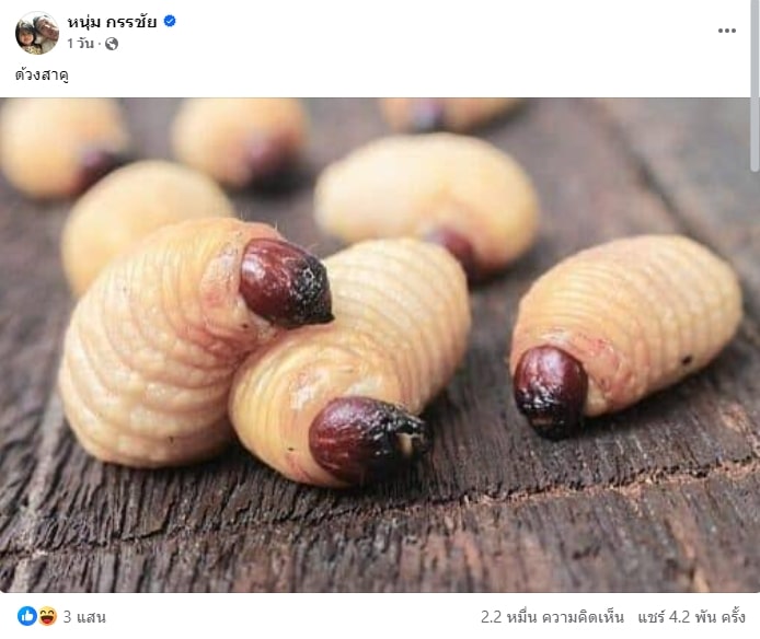 “พี่หนุ่ม กรรชัยโชว์เหนือ โพสต์รูปด้วง สาคู ไม่ถึง 1 ชั่วโมงคนไลก์จะแสนแล้ว คนทาย เอ๊ะ หรือจะหมายถึงอินฟลูประตูน้ำ ดูคล้ายๆอยู่ แฟนคลับบอก คำใบ้นี้ คนใต้รู้ดี ลองถามคนใต้ดู เวลาสั่งด้วงทอด เค้าสั่งว่าอะไร อะจยางงายยย 5555555555”