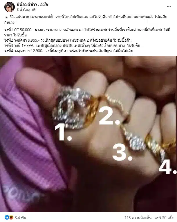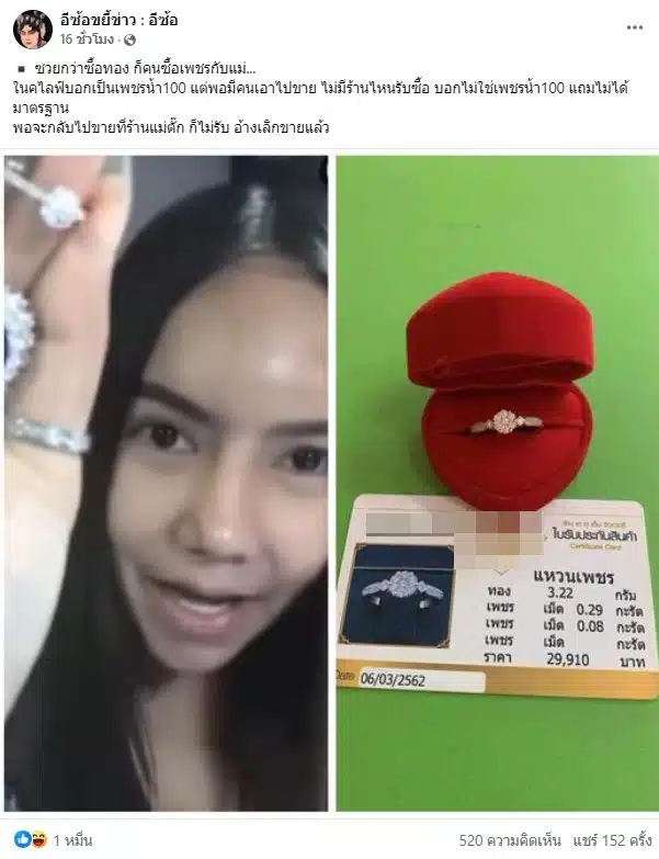 เจ้าทุกข์โผล่อีก ซื้อเพชรร้านแม่ตั๊ก อ้างเป็นเพชรน้ำร้อย ขายต่อไม่มีร้านไหนรับซื้อ