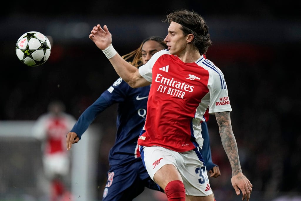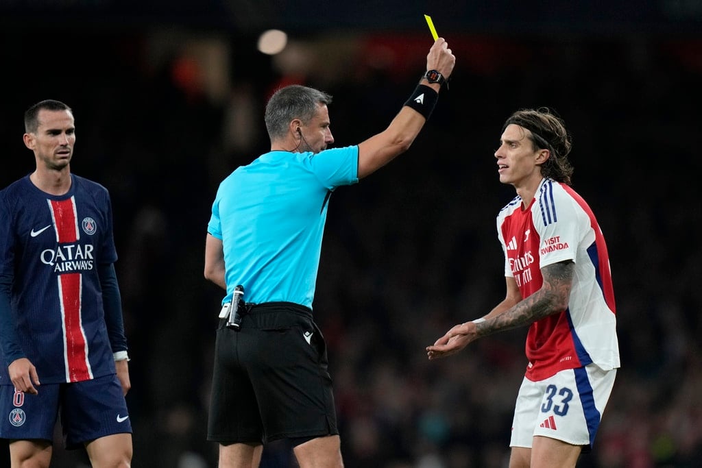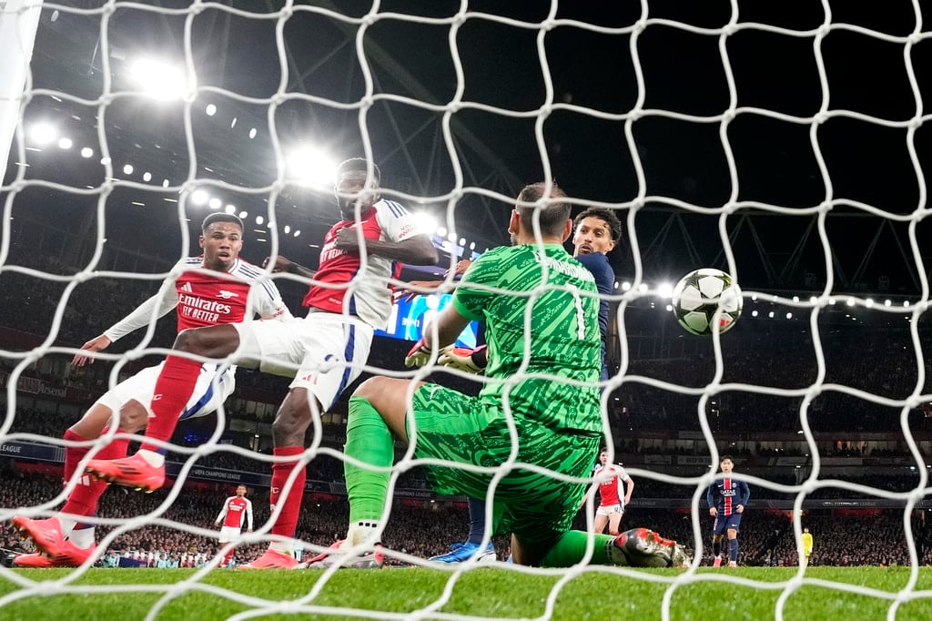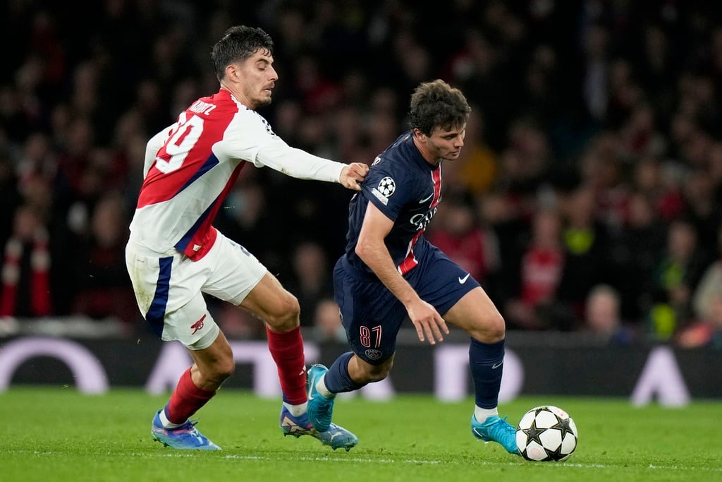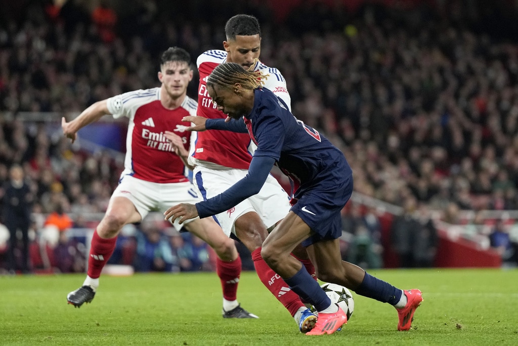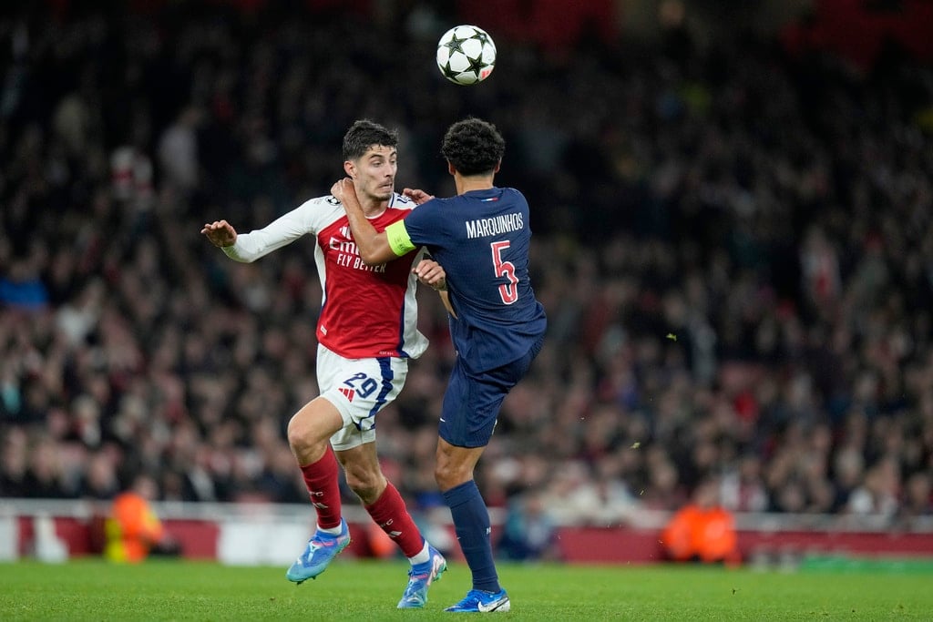 Arsenal’s Bukayo Saka celebrates scoring their side’s second goal during the Champions League opening phase soccer match between Arsenal FC and Paris Saint-Germain at Arsenal stadium in London, England, Tuesday, Oct. 1, 2024. (Adam Davy/PA via AP)Arsenal’s William Saliba steps on the foot of PSG’s Bradley Barcola during a Champions League opening phase soccer match between Arsenal FC and Paris Saint-Germain at Arsenal stadium in London, England, Tuesday, Oct. 1, 2024. (AP Photo/Alastair Grant)Arsenal’s Kai Havertz grabs the shirt of PSG’s Joao Neves during a Champions League opening phase soccer match between Arsenal FC and Paris Saint-Germain at Arsenal stadium in London, England, Tuesday, Oct. 1, 2024. (AP Photo/Alastair Grant)Referee Slavko Vincic shows a yellow card to both Arsenal’s Riccardo Calafiori and PSG’s Fabian Ruiz, left, during a Champions League opening phase soccer match between Arsenal FC and Paris Saint-Germain at Arsenal stadium in London, England, Tuesday, Oct. 1, 2024. (AP Photo/Alastair Grant)PSG’s Bradley Barcola runs with the ball during a Champions League opening phase soccer match between Arsenal FC and Paris Saint-Germain at Arsenal stadium in London, England, Tuesday, Oct. 1, 2024. (AP Photo/Alastair Grant)Arsenal’s Riccardo Calafiori, foreground, vies for the ball with PSG’s Bradley Barcola during a Champions League opening phase soccer match between Arsenal FC and Paris Saint-Germain at Arsenal stadium in London, England, Tuesday, Oct. 1, 2024. (AP Photo/Alastair Grant)PSG’s goalkeeper Gianluigi Donnarumma, center, fails to stop a free kick by Arsenal’s Bukayo Saka to concede a second goal during a Champions League opening phase soccer match between Arsenal FC and Paris Saint-Germain at Arsenal stadium in London, England, Tuesday, Oct. 1, 2024. (AP Photo/Alastair Grant)PSG’s Marquinhos fights for the ball with Arsenal’s Kai Havertz during a Champions League opening phase soccer match between Arsenal FC and Paris Saint-Germain at Arsenal stadium in London, England, Tuesday, Oct. 1, 2024. (AP Photo/Alastair Grant)Arsenal’s Kai Havertz, center, celebrates after teammate Bukayo Saka scored their side’s second goal during a Champions League opening phase soccer match between Arsenal FC and Paris Saint-Germain at Arsenal stadium in London, England, Tuesday, Oct. 1, 2024. (AP Photo/Alastair Grant)