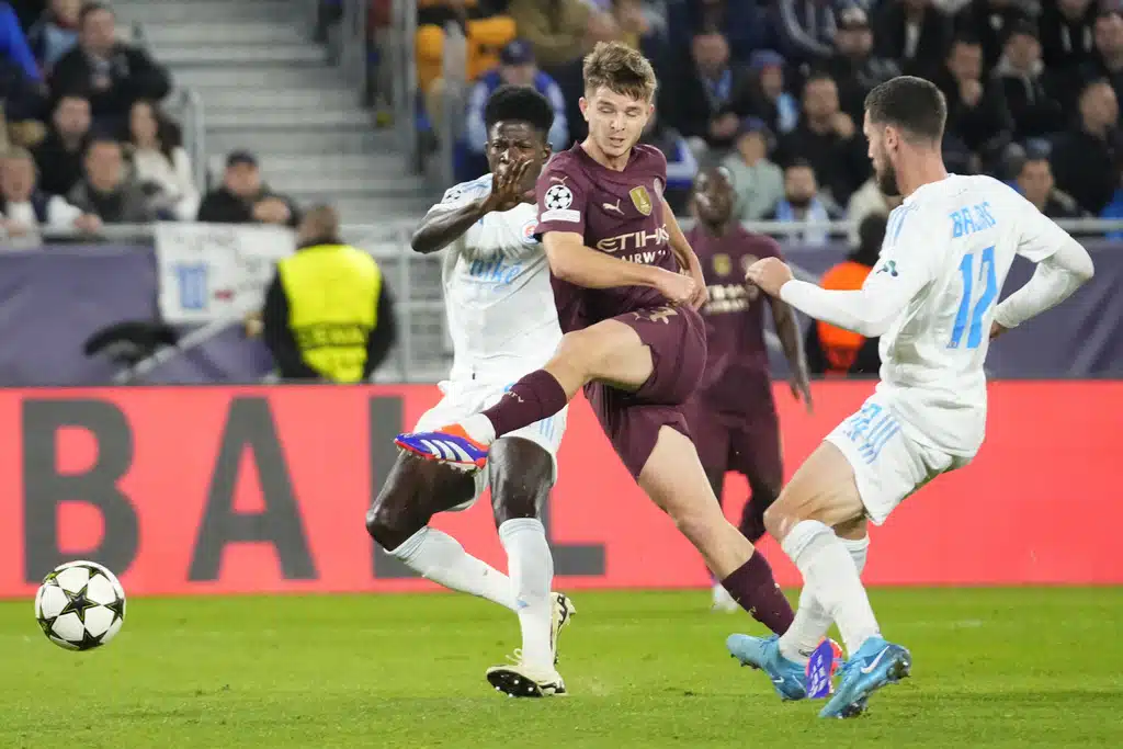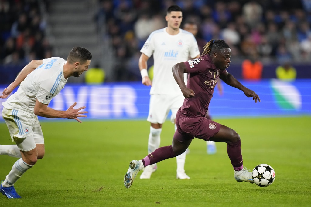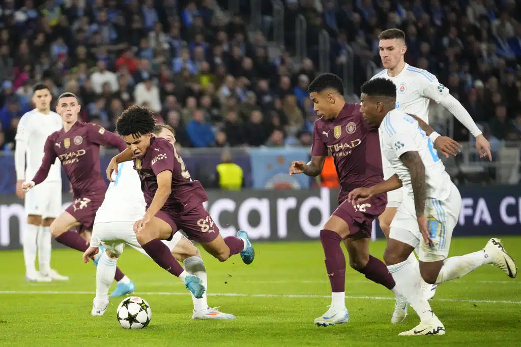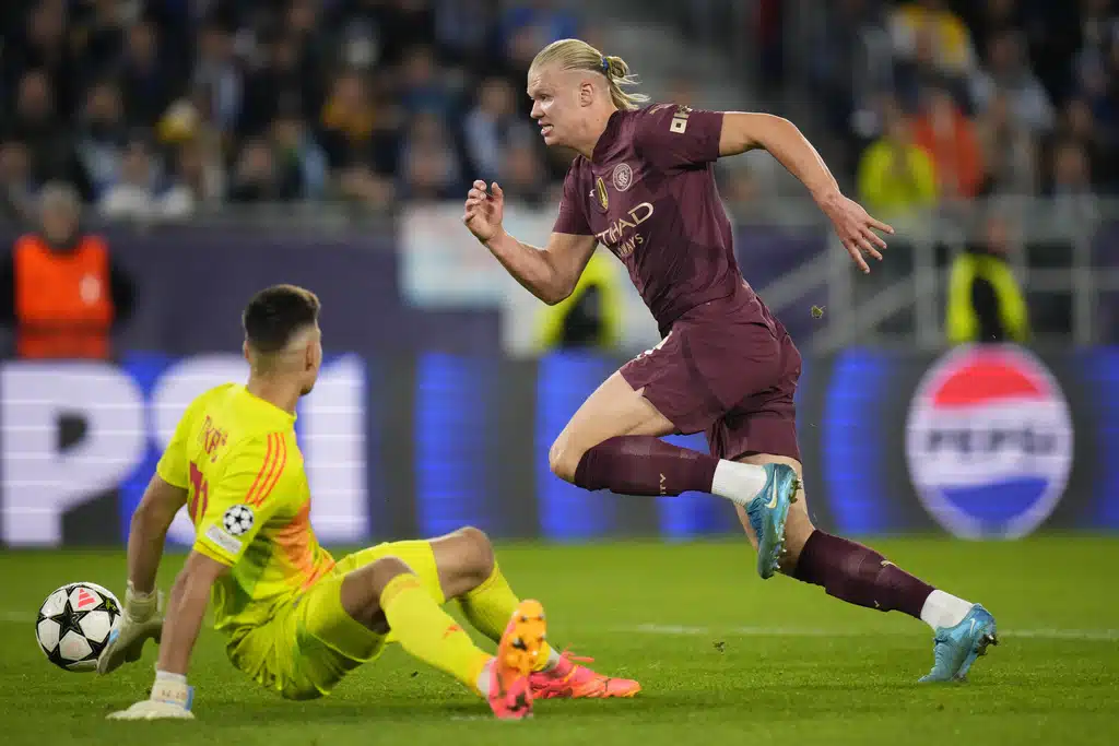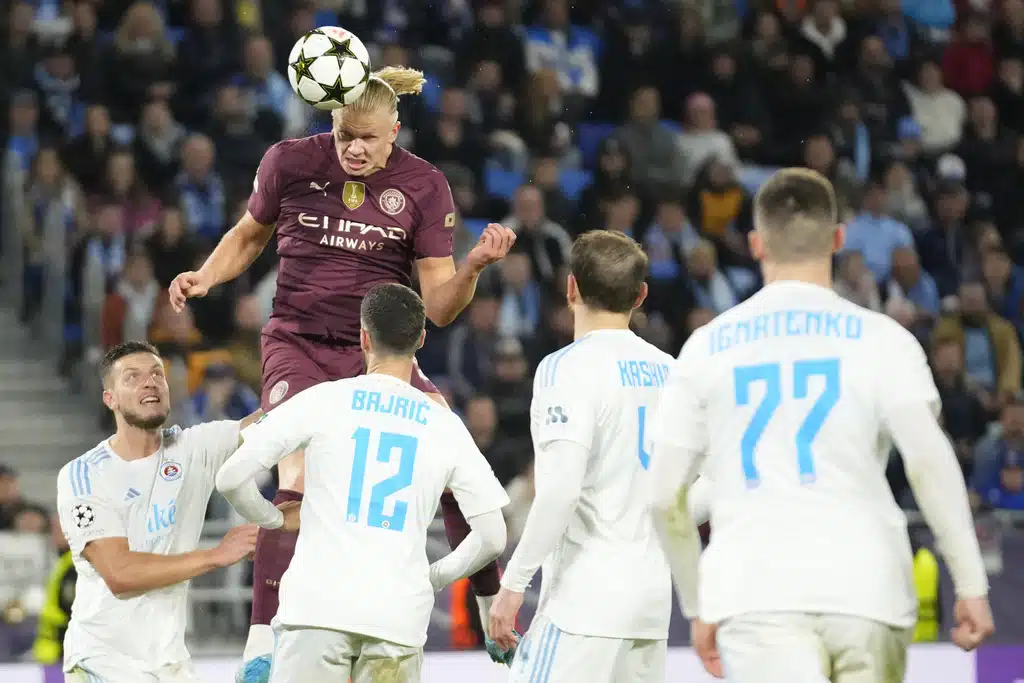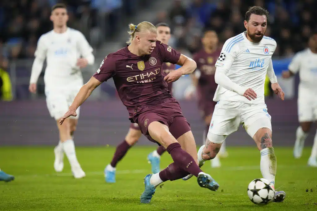 Manchester City’s Erling Haaland takes a shot during the Champions League opening phase soccer match between Slovan Bratislava and Manchester City in Bratislava, Slovakia, Tuesday, Oct. 1, 2024. (AP Photo/Petr Josek)Manchester City’s Erling Haaland gets in a header during the Champions League opening phase soccer match between Slovan Bratislava and Manchester City in Bratislava, Slovakia, Tuesday, Oct. 1, 2024. (AP Photo/Petr Josek)Manchester City’s Erling Haaland takes the ball past Slovan’s goalkeeper Dominik Takac to score his side’s throw goal during the Champions League opening phase soccer match between Slovan Bratislava and Manchester City in Bratislava, Slovakia, Tuesday, Oct. 1, 2024. (AP Photo/Petr Josek)Manchester City’s John Stones gets above Slovan’s Tigran Barseghyan to win a header during the Champions League opening phase soccer match between Slovan Bratislava and Manchester City in Bratislava, Slovakia, Tuesday, Oct. 1, 2024. (AP Photo/Petr David Josek)Manchester City’s Rico Lewis goes down under a challenge during the Champions League opening phase soccer match between Slovan Bratislava and Manchester City in Bratislava, Slovakia, Tuesday, Oct. 1, 2024. (AP Photo/Petr Josek)Manchester City’s James McAtee scores his side’s fourth goal during the Champions League opening phase soccer match between Slovan Bratislava and Manchester City in Bratislava, Slovakia, Tuesday, Oct. 1, 2024. (AP Photo/Petr David Josek)Manchester City’s James McAtee celebrates after scoring his side’s fourth goal during the Champions League opening phase soccer match between Slovan Bratislava and Manchester City in Bratislava, Slovakia, Tuesday, Oct. 1, 2024. (AP Photo/Petr David Josek)Manchester City’s Jeremy Doku runs with the ball during the Champions League opening phase soccer match between Slovan Bratislava and Manchester City in Bratislava, Slovakia, Tuesday, Oct. 1, 2024. (AP Photo/Petr Josek)