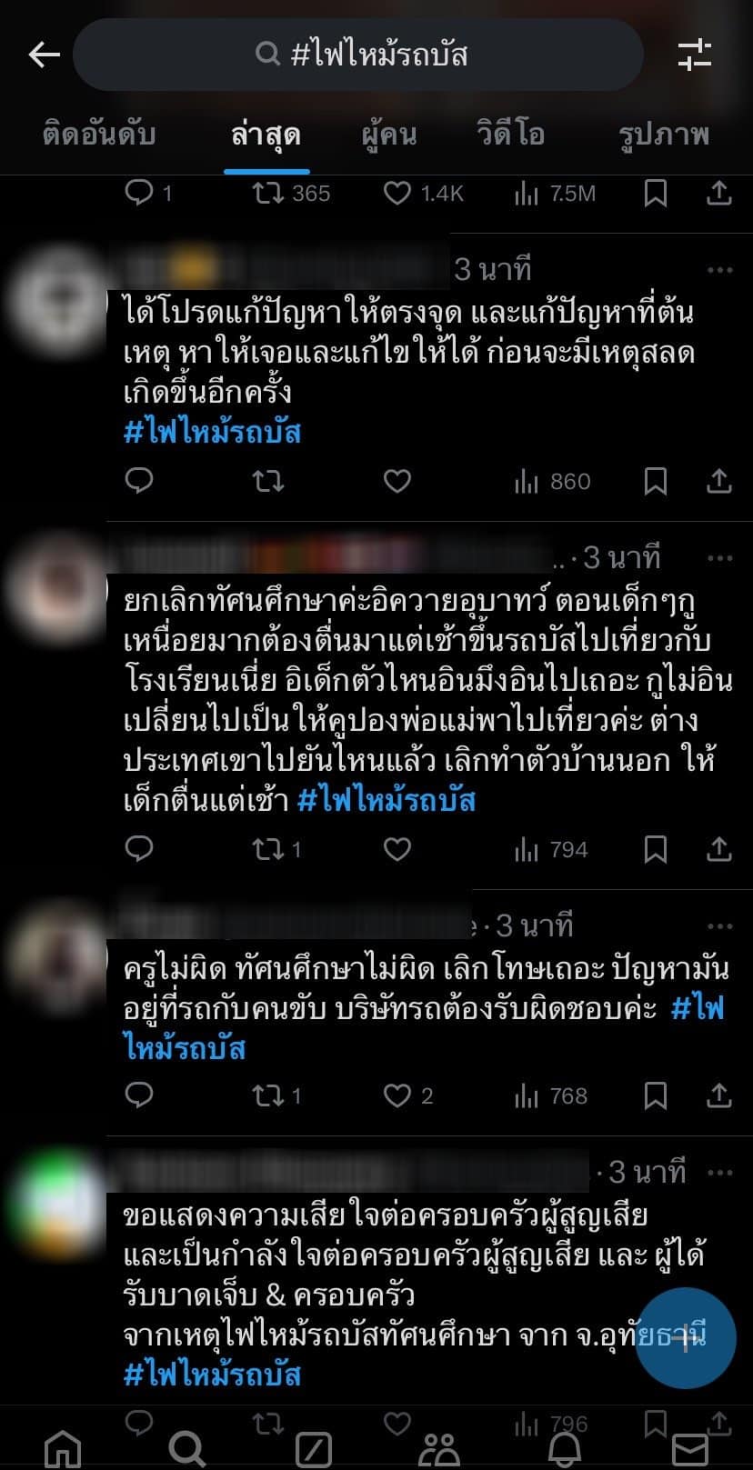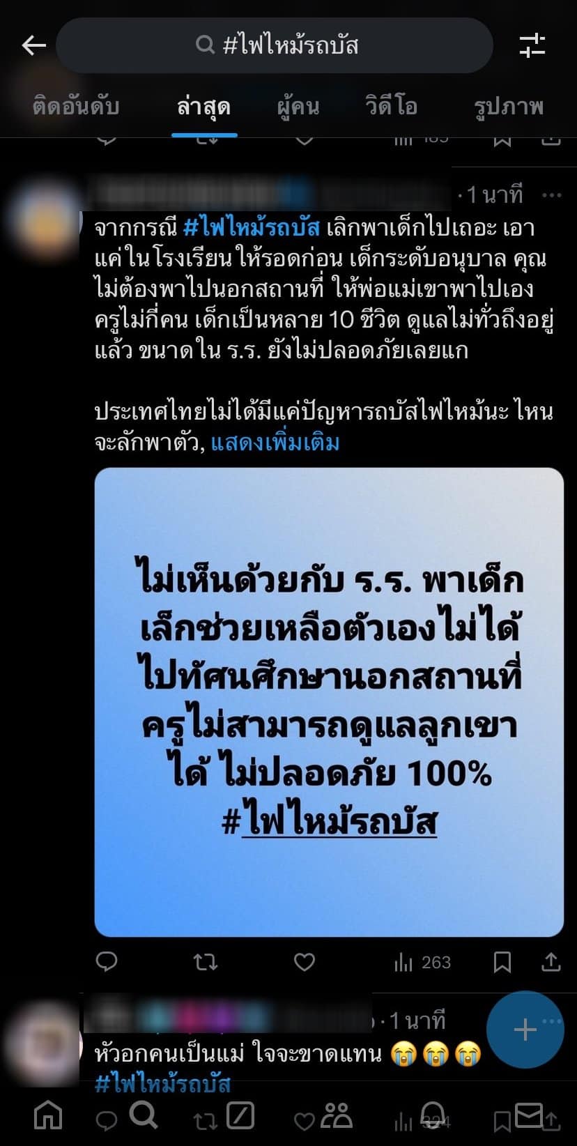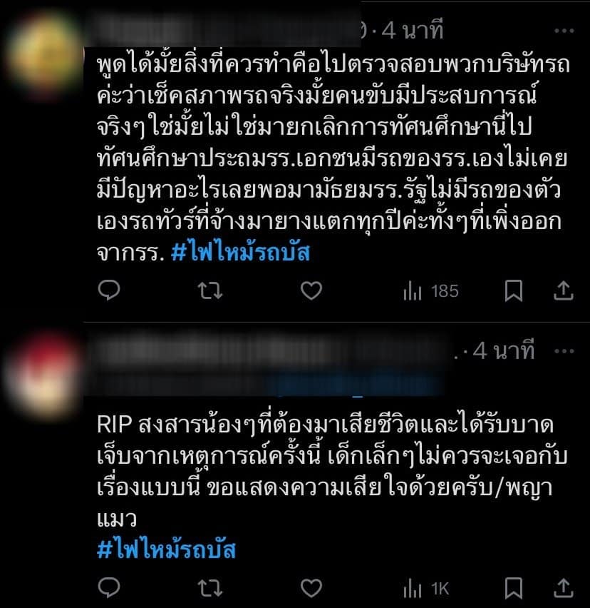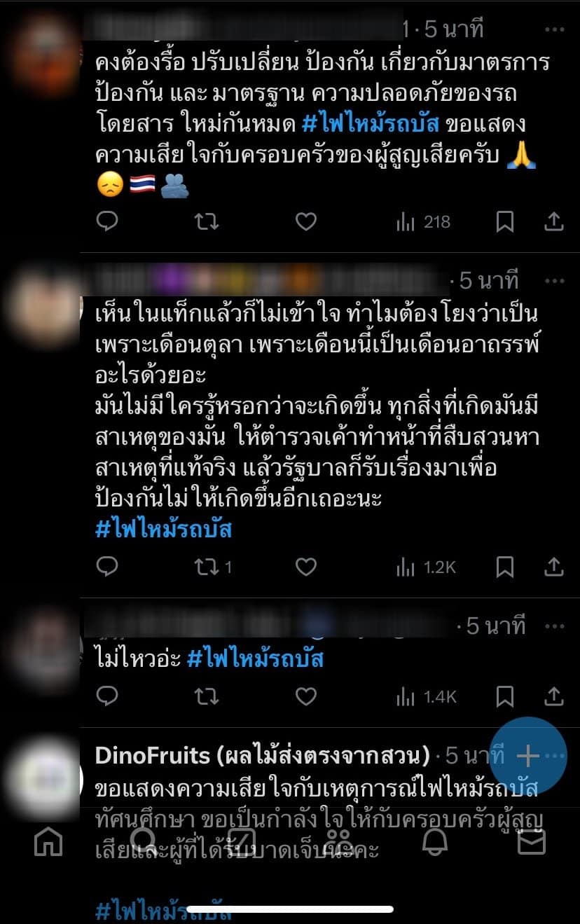 เหตุที่เกิดขึ้นสร้างความสะเทือนใจให้แก่คนไทยเป็นอย่างมาก จน #ไฟไหม้รสบัส พุ่งติดเทรนด์ X เป็นอันดับ 1 ในประเทศไทยกันเลยทีเดียว ขณะที่ชาวเน็ตต่างก็ออกมาพูดถึงเรื่องราวที่เกิดขึ้น และแสดงความเสียใจกับครอบครัวของผู้เสียชีวิตกันอย่างมาก