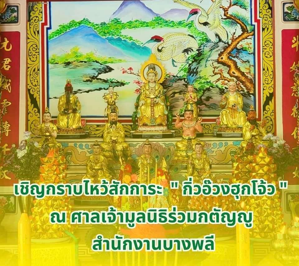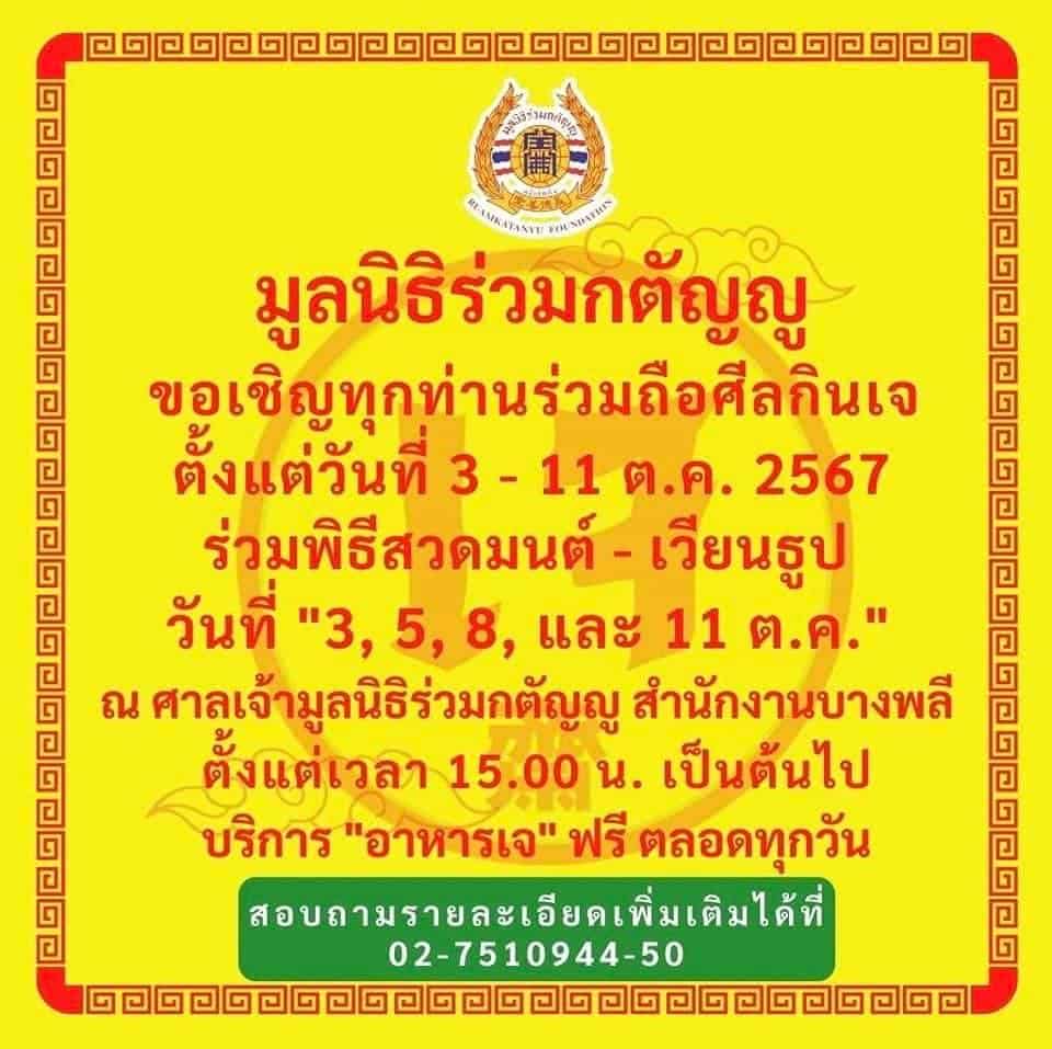 ต้อนรับเทศกาลกินเจ 2567 มูลนิธิร่วมกตัญญู ขอเชิญชวนสาธุชนร่วมถือศีล อิ่มบุญ อิ่มใจ ณ สำนักงานบางพลี อ.บางพลี จ.สมุทรปราการ ในวันที่ 3-11 ตุลาคม 2567 ซึ่งจะตรงกับวันขึ้น 1 ค่ำ ถึง 9 ค่ำ เดือน 9 ของทุกปี ตามปฏิทินจันทรคติแบบจีน พร้อมสักการะ “กิ้วอ๊วงฮุกโจ้ว” หรือพระพุทธ 9 องค์เสด็จลงมาโปรดสัตว์ในเมืองมนุษย์ เพื่อความเป็นสิริมงคล และรับบริการอาหารเจฟรี ตั้งแต่เวลา 08:00-16:00 น.