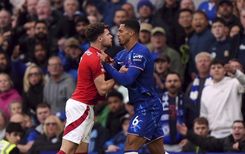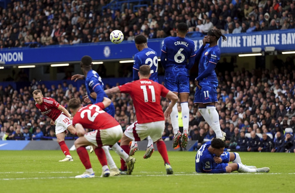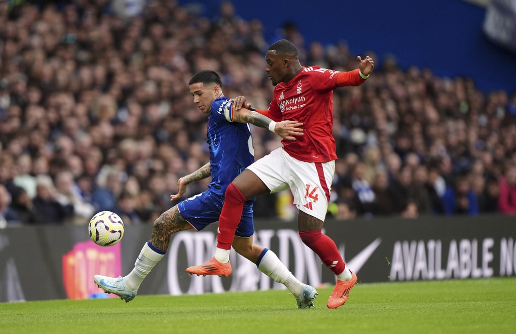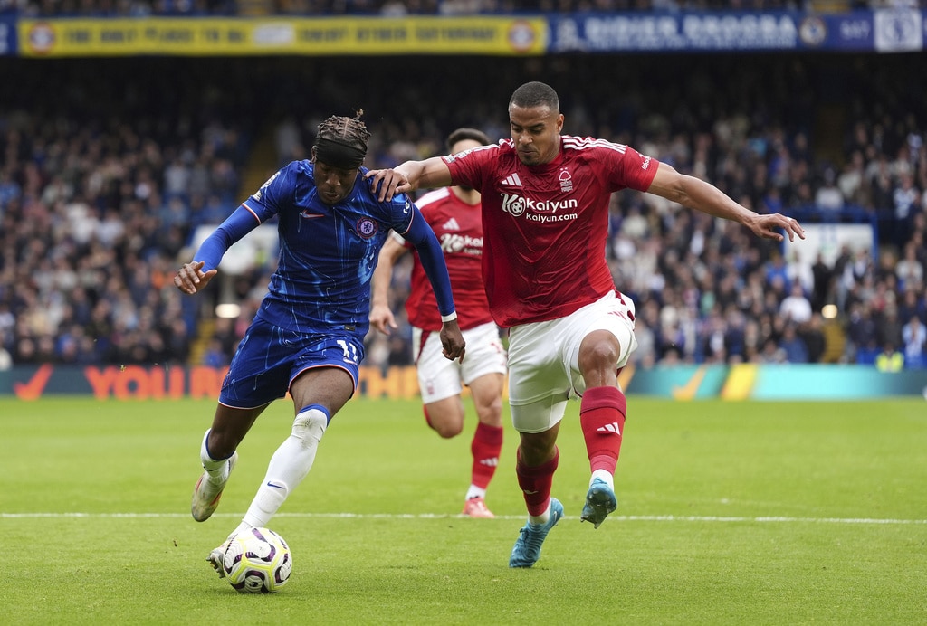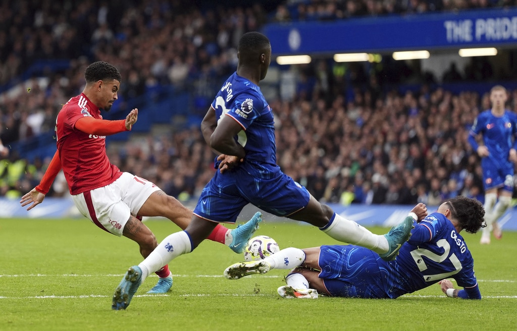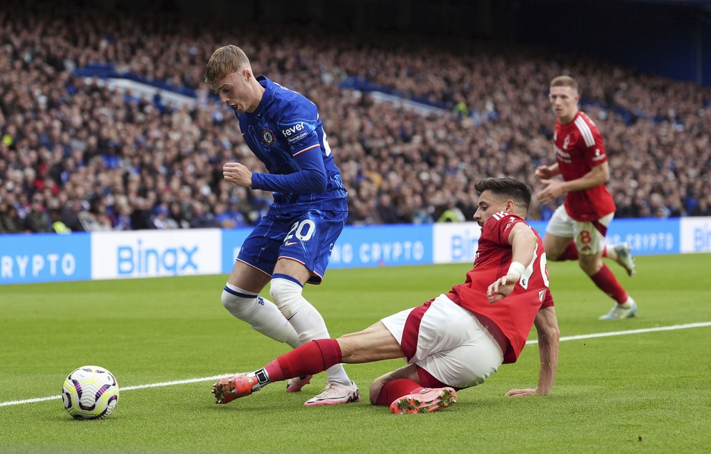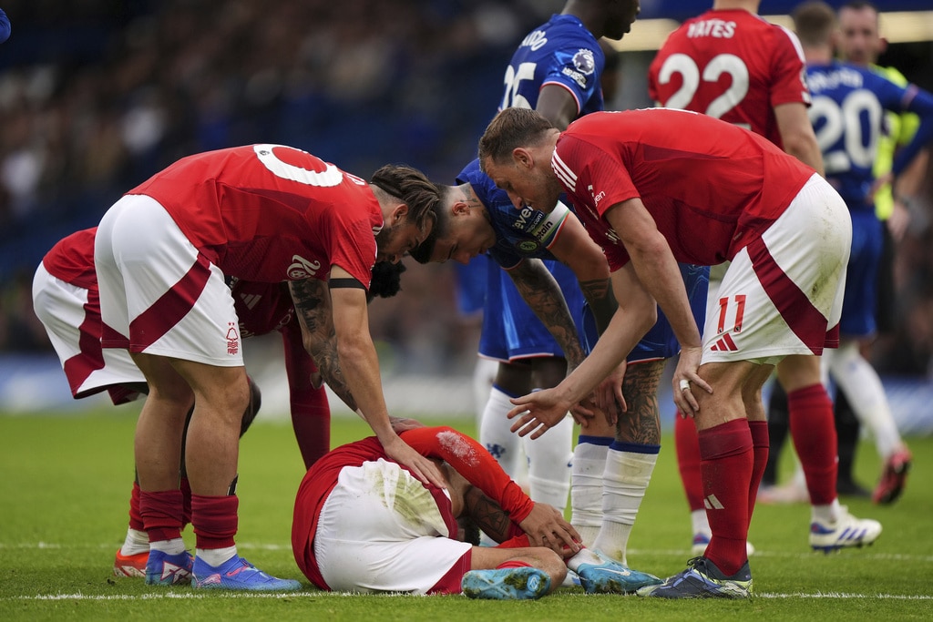 Chelsea’s Noni Madueke, left, crosses the ball under pressure from Nottingham Forest’s Alex Moreno during the English Premier League soccer match between Chelsea and Nottingham Forest at Stamford Bridge in London, Sunday Oct. 6, 2024. (Bradley Collyer/PA via AP)Tempers flare between Nottingham Forest’s Neco Williams and Chelsea’s Levi Colwill, right, during the English Premier League soccer match between Chelsea and Nottingham Forest at Stamford Bridge in London, Sunday Oct. 6, 2024. (Bradley Collyer/PA via AP)Nottingham Forest’s Morgan Gibbs-White picks up an injury during the English Premier League soccer match between Chelsea and Nottingham Forest at Stamford Bridge in London, Sunday Oct. 6, 2024. (Bradley Collyer/PA via AP)Nottingham Forest’s James Ward-Prowse shoots direct from a free-kick during the English Premier League soccer match between Chelsea and Nottingham Forest at Stamford Bridge in London, Sunday Oct. 6, 2024. (Bradley Collyer/PA via AP)Nottingham Forest’s Morgan Gibbs-White, left, has a shot and picks up an injury during the English Premier League soccer match between Chelsea and Nottingham Forest at Stamford Bridge in London, Sunday Oct. 6, 2024. (Bradley Collyer/PA via AP)Nottingham Forest’s Morgan Gibbs-White appears injured during the English Premier League soccer match between Chelsea and Nottingham Forest at Stamford Bridge in London, Sunday Oct. 6, 2024. (Bradley Collyer/PA via AP)Chelsea’s Noni Madueke and Nottingham Forest’s Murillo, right, fight for the ball during the English Premier League soccer match between Chelsea and Nottingham Forest at Stamford Bridge in London, Sunday Oct. 6, 2024. (Bradley Collyer/PA via AP)Chelsea’s Cole Palmer and Nottingham Forest’s Alex Moreno, right, battle for the ball during the English Premier League soccer match between Chelsea and Nottingham Forest at Stamford Bridge in London, Sunday Oct. 6, 2024. (Bradley Collyer/PA via AP)Chelsea’s Enzo Fernandez and Nottingham Forest’s Callum Hudson-Odoi, right, during the English Premier League soccer match between Chelsea and Nottingham Forest at Stamford Bridge in London, Sunday Oct. 6, 2024. (Bradley Collyer/PA via AP)