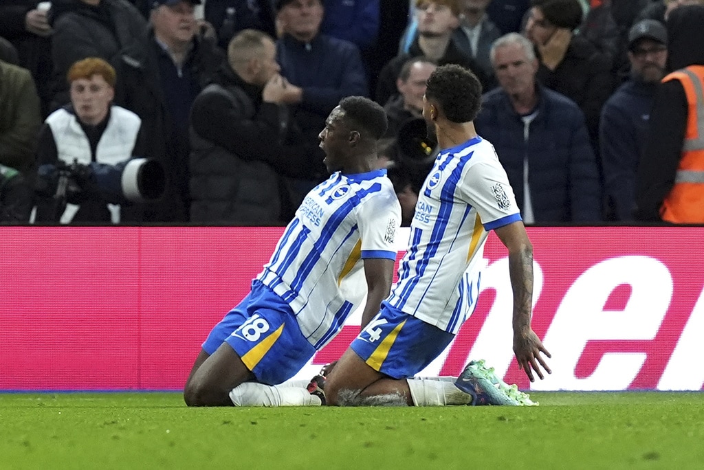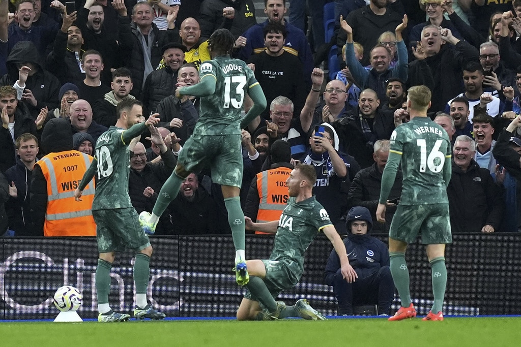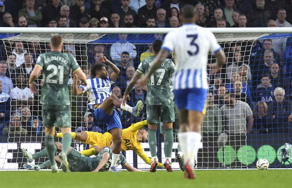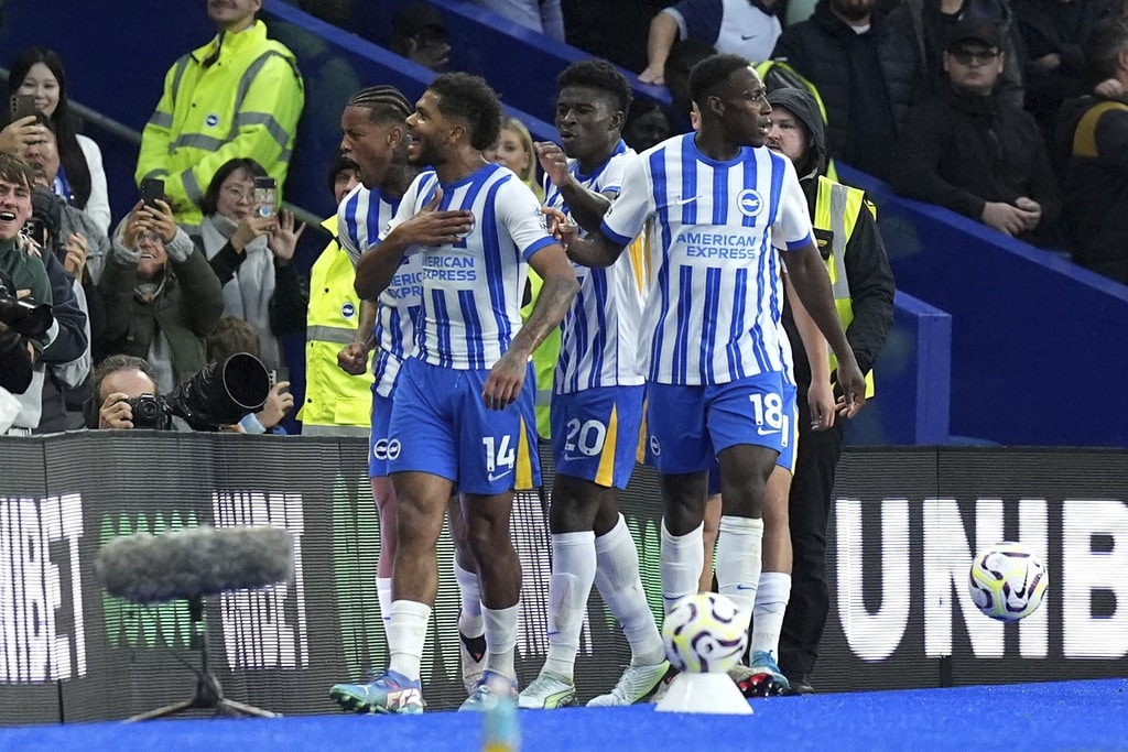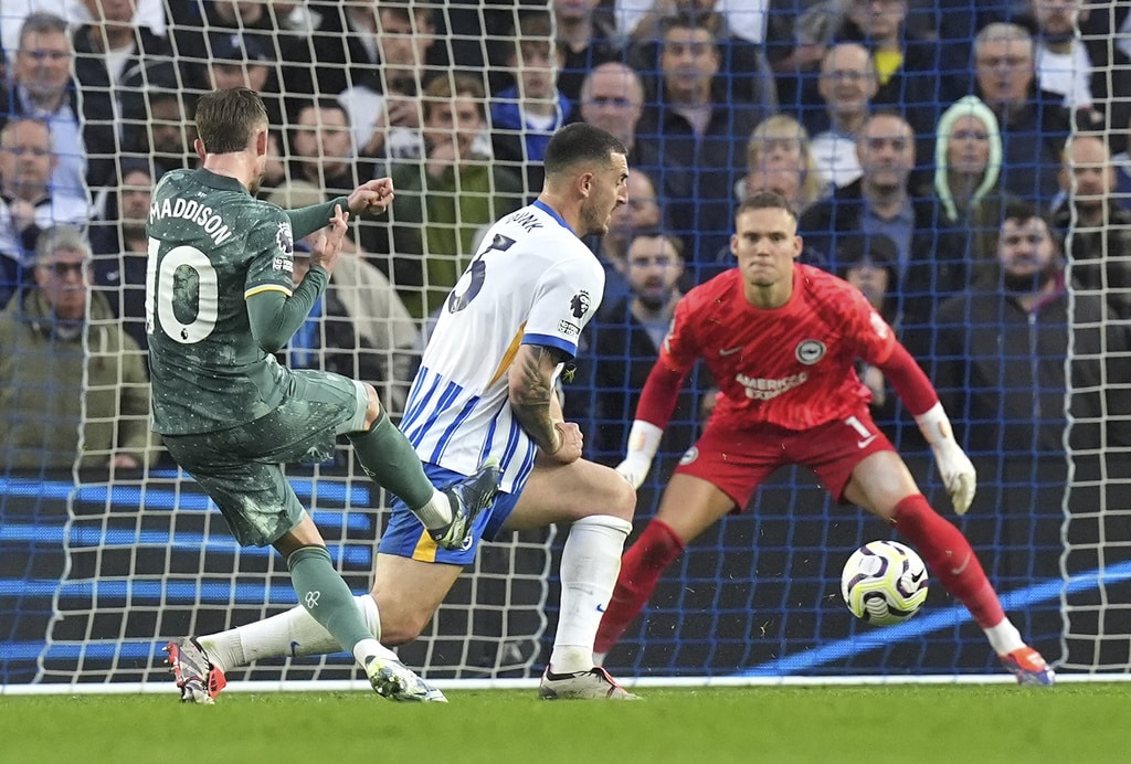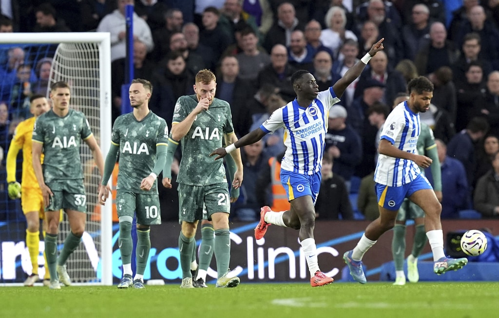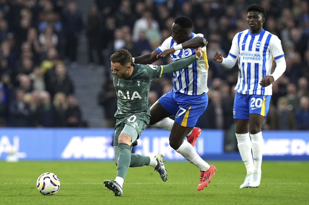 Tottenham Hotspur’s James Maddison, left, and Brighton and Hove Albion’s Yankuba Minteh battle for the ball during the Premier League match at the American Express Stadium, Brighton, England, Sunday Oct. 6, 2024. (Gareth Fuller/PA via AP)Brighton and Hove Albion’s Danny Welbeck, left, celebrates scoring their side’s third goal of the game with team-mate Georginio Rutter during the Premier League match at the American Express Stadium, Brighton, England, Sunday Oct. 6, 2024. (Gareth Fuller/PA via AP)Brighton and Hove Albion’s Georginio Rutter, second left, celebrates scoring their side’s second goal of the game with team-mates during the Premier League match at the American Express Stadium, Brighton, England, Sunday Oct. 6, 2024. (Gareth Fuller/PA via AP)Brighton and Hove Albion’s Georginio Rutter, centre, scores their side’s second goal of the game during the Premier League match at the American Express Stadium, Brighton, England, Sunday Oct. 6, 2024. (Gareth Fuller/PA via AP)Brighton and Hove Albion’s Yankuba Minteh, second right, celebrates scoring their side’s first goal of the game during the Premier League match at the American Express Stadium, Brighton, England, Sunday Oct. 6, 2024. (Gareth Fuller/PA via AP)Tottenham Hotspur’s James Maddison, left, scores their side’s second goal of the game during the Premier League match at the American Express Stadium, Brighton, England, Sunday Oct. 6, 2024. (Gareth Fuller/PA via AP)Tottenham Hotspur’s James Maddison, left, celebrates scoring their side’s second goal of the game during the Premier League match at the American Express Stadium, Brighton, England, Sunday Oct. 6, 2024. (Gareth Fuller/PA via AP)
