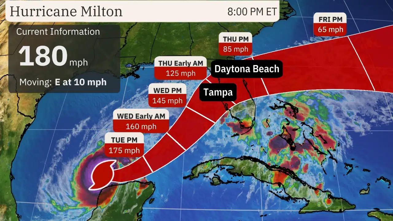พายุเฮอริเคนมิลตัน ก่อตัวขึ้นหลังจากพายุเฮอริเคนเฮเลนพัดถล่มฟลอริดาเมื่อไม่ถึง 2 สัปดาห์ที่ผ่านมา ล่าสุด (7 ตุลาคม) มิลตันได้ทวีกำลังขึ้นเป็นพายุระดับ 5 ตามมาตราแซฟเฟอร์-ซิมป์สัน ซึ่งมีความเร็วลมสูงสุดมากกว่า 252 กิโลเมตรต่อชั่วโมง
