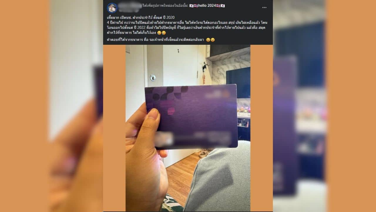 สายรายหนึ่งโพสต์เรื่องราวของตัวเอง ฝากเงินกับธนาคารมา 4 ปี จะไปถอนเงินและปิดบัญชี ต้องเจอเรื่องช็อก เมื่อเงินหายหมดบัญชีตั้งแต่ 2 ปีก่อน