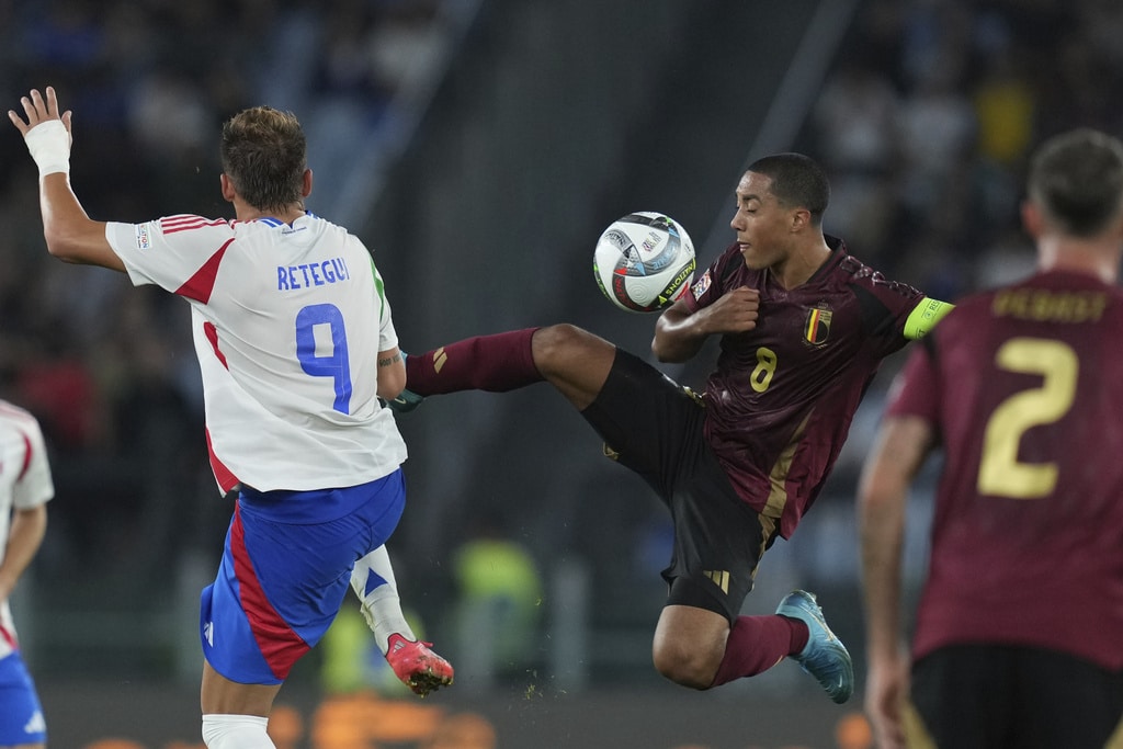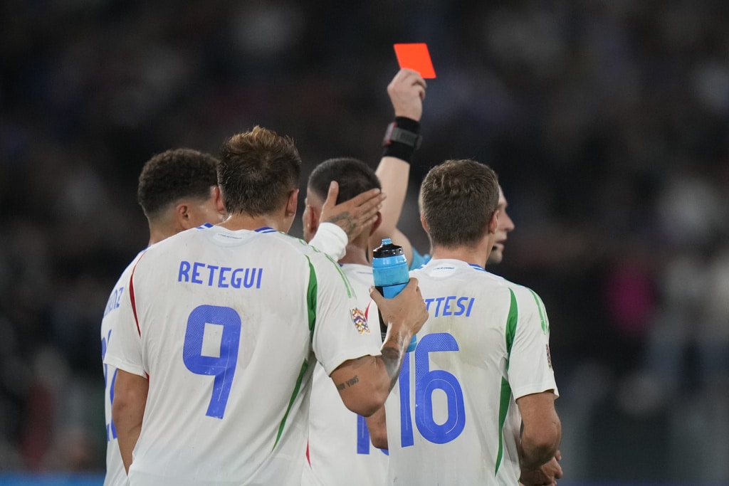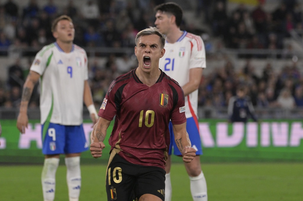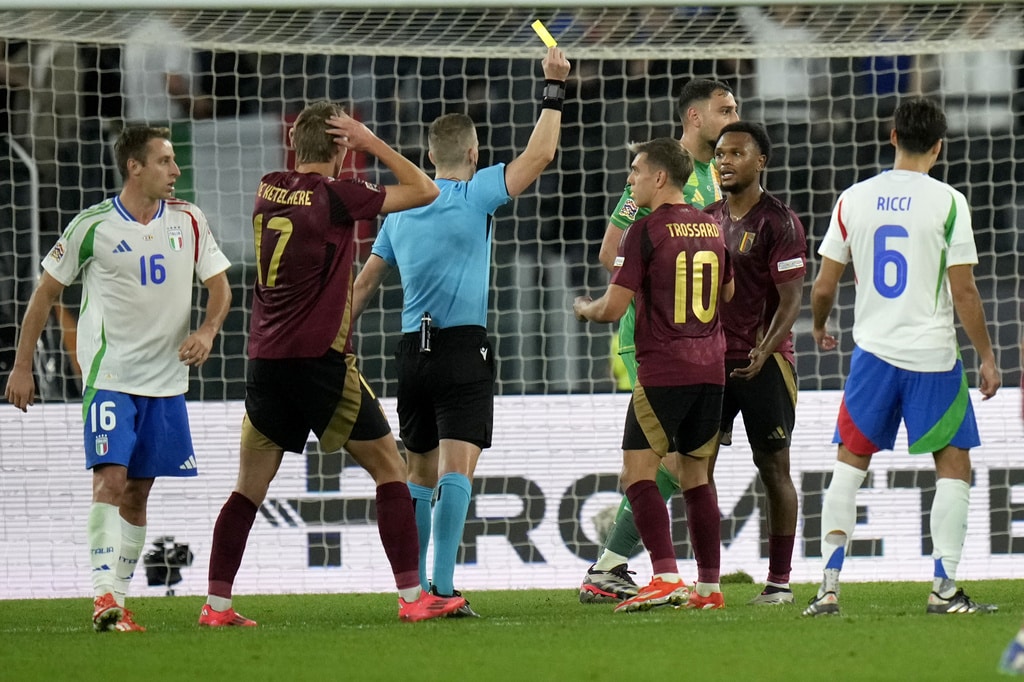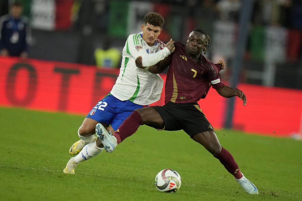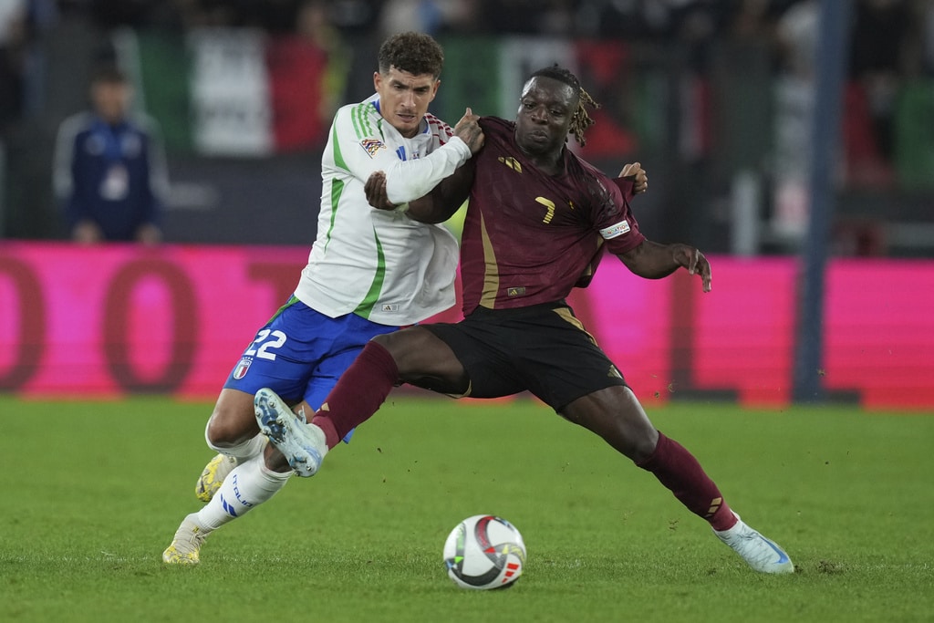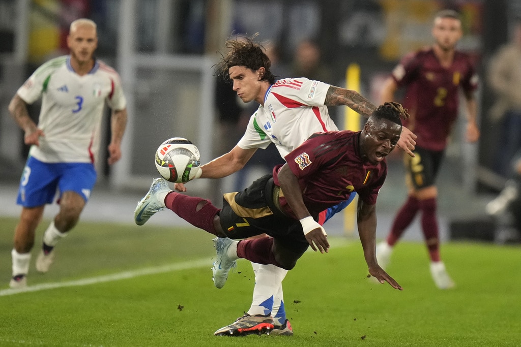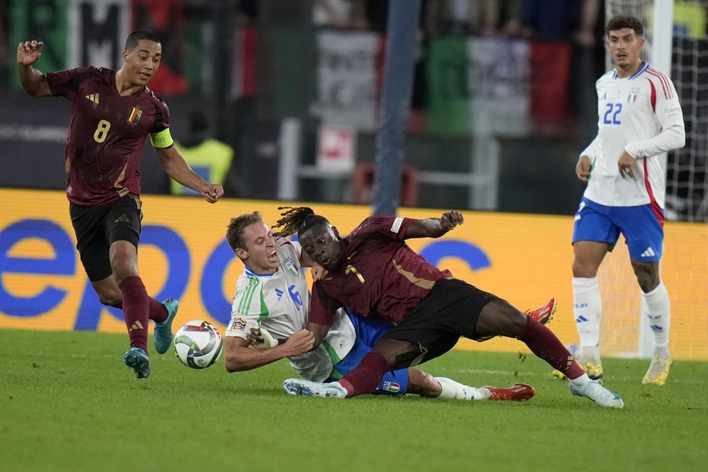 Belgium’s Orel Mangala, center, heads the ball as Italy’s Mateo Retegui, left, defends during the UEFA Nations League soccer match between Italy and Belgium at the Stadio Olimpico in Rome, Italy, on Thursday, Oct. 10, 2024. (AP Photo/Alessandra Tarantino)Italy’s head coach Luciano Spalletti reacts during the UEFA Nations League soccer match between Italy and Belgium at the Stadio Olimpico in Rome, Italy, on Thursday, Oct. 10, 2024. (Alfredo Falcone/LaPresse via AP)Italy’s Giovanni Di Lorenzo, left, and Belgium’s Jeremy Doku battle for the ball during the UEFA Nations League soccer match between Italy and Belgium at the Stadio Olimpico in Rome, Italy, Thursday, Oct. 10, 2024. (Alfredo Falcone/LaPresse via AP)Italy’s Mateo Retegui, left, and Belgium’s Youri Tieleman battle for the ball during the UEFA Nations League soccer match between Italy and Belgium at the Stadio Olimpico in Rome, Italy, Thursday, Oct. 10, 2024. (Alfredo Falcone/LaPresse via AP)Belgium’s Jeremy Doku, center right, falls as he fights for the ball with Italy’s Riccardo Calafiori during the UEFA Nations League soccer match between Italy and Belgium at the Stadio Olimpico in Rome, Italy, on Thursday, Oct. 10, 2024. (AP Photo/Alessandra Tarantino)Italy’s Davide Frattesi, center left, fights for the ball with Belgium’s Jeremy Doku, center right, during the UEFA Nations League soccer match between Italy and Belgium at the Stadio Olimpico in Rome, Italy, on Thursday, Oct. 10, 2024. (AP Photo/Alessandra Tarantino)Italy’s Giovanni Di Lorenzo, left, fights for the ball with Belgium’s Jeremy Doku during the UEFA Nations League soccer match between Italy and Belgium at the Stadio Olimpico in Rome, Italy, on Thursday, Oct. 10, 2024. (AP Photo/Alessandra Tarantino)Belgium’s Leandro Trossard celebrates scoring during the UEFA Nations League soccer match between Italy and Belgium at the Stadio Olimpico in Rome, Italy, on Thursday, Oct. 10, 2024. (Fabrizio Corradetti/LaPresse via AP)Italy’s Lorenzo Pellegrini, center, receives a red card during the UEFA Nations League soccer match between Italy and Belgium at the Stadio Olimpico in Rome, Italy, on Thursday, Oct. 10, 2024. (AP Photo/Alessandra Tarantino)Belgium’s Leandro Trossard, fourth right, receives a yellow card during the UEFA Nations League soccer match between Italy and Belgium at the Stadio Olimpico in Rome, Italy, on Thursday, Oct. 10, 2024. (AP Photo/Alessandra Tarantino)