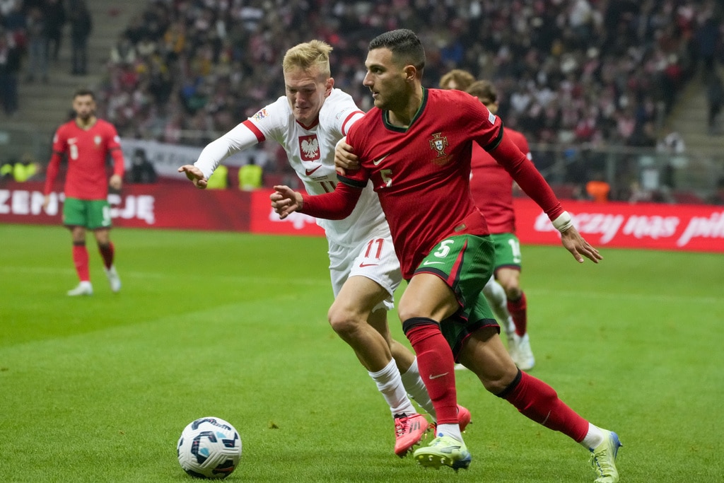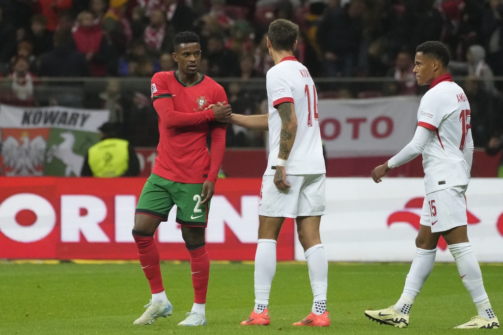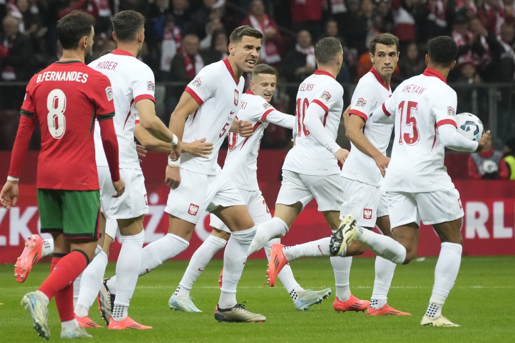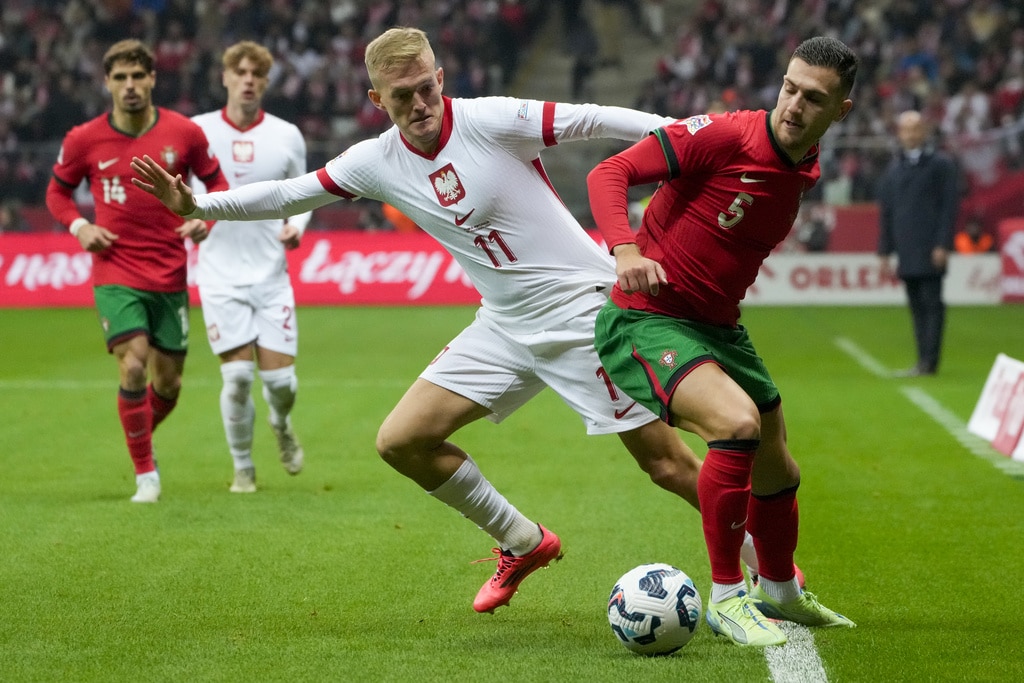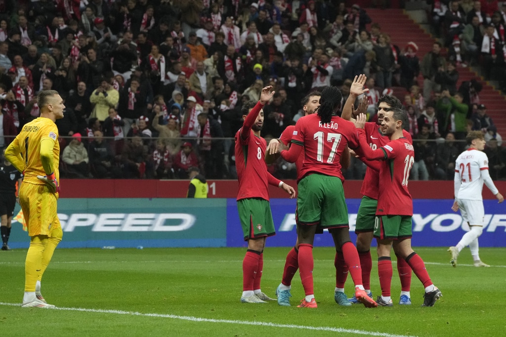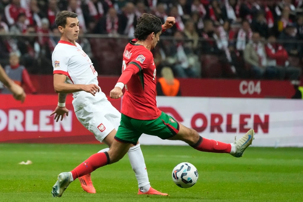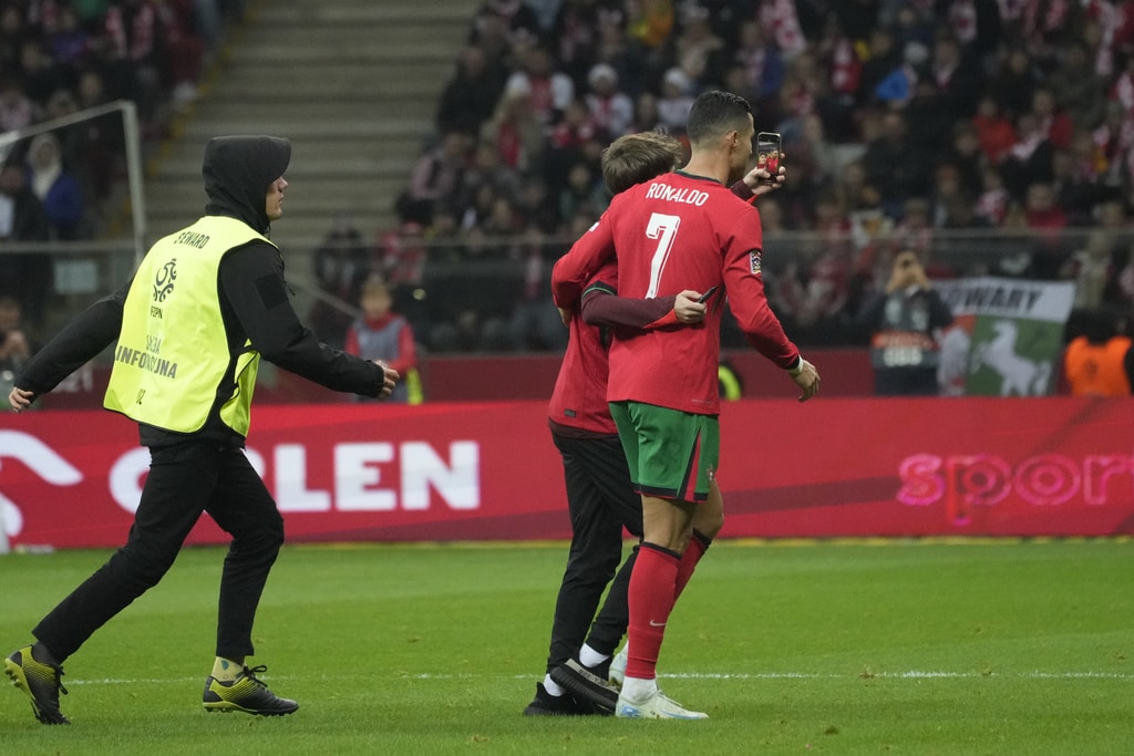 Poland’s Sebastian Walukiewicz, left, and Portugal’s Rafael Leao vie for the ball during the UEFA Nations League soccer match between Poland and Portugal at Narodowy stadium in Warsaw, Poland, Saturday, Oct. 12, 2024. (AP Photo/Czarek Sokolowski)Portugal’s Nelson Semedo, left, and Poland’s Jakub Kiwior, center, shake hands at the end of the UEFA Nations League soccer match between Poland and Portugal at Narodowy stadium in Warsaw, Poland, Saturday, Oct. 12, 2024. (AP Photo/Czarek Sokolowski)Poland’s Jakub Kiwior, left, and Portugal’s Francisco Trincao compete for the ball during the UEFA Nations League soccer match between Poland and Portugal at Narodowy stadium in Warsaw, Poland, Saturday, Oct. 12, 2024. (AP Photo/Czarek Sokolowski)Poland’s Piotr Zielinski, center, is congratulated after scoring his side’s first goal during the UEFA Nations League soccer match between Poland and Portugal at Narodowy stadium in Warsaw, Poland, Saturday, Oct. 12, 2024. (AP Photo/Czarek Sokolowski)A pitch invader takes a selfie with Portugal’s Cristiano Ronaldo as he left the pitch after being substituted during the UEFA Nations League soccer match between Poland and Portugal at Narodowy stadium in Warsaw, Poland, Saturday, Oct. 12, 2024. (AP Photo/Czarek Sokolowski)Portugal’s Diogo Dalot, right, and Poland’s Karol Swiderski vie for the ball during the UEFA Nations League soccer match between Poland and Portugal at Narodowy stadium in Warsaw, Poland, Saturday, Oct. 12, 2024. (AP Photo/Czarek Sokolowski)Portugal’s Diogo Dalot, right, and Poland’s Karol Swiderski vie for the ball during the UEFA Nations League soccer match between Poland and Portugal at Narodowy stadium in Warsaw, Poland, Saturday, Oct. 12, 2024. (AP Photo/Czarek Sokolowski)Portugal’s Rafael Leao (17) is congratulated after assisting Cristiano Ronaldo for his side’s second goal during the UEFA Nations League soccer match between Poland and Portugal at Narodowy stadium in Warsaw, Poland, Saturday, Oct. 12, 2024. (AP Photo/Czarek Sokolowski)