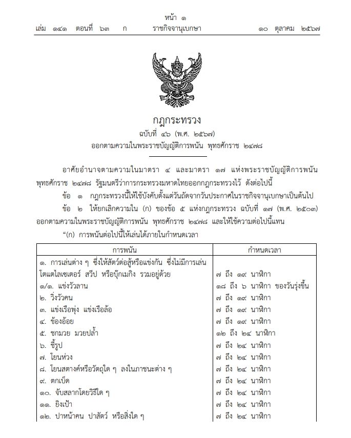 ราชกิจจานุเบกษา เผยแพร่ กฎกระทรวง ฉบับที่ 46 ให้การพนันจำนวน 23 ชนิด ต่อไปนี้ ให้เล่นได้ภายในกำหนดเวลา โดยในเอกสารระบุว่า “อาศัยอำนาจตามความในมาตรา 4 และมาตรา 17 แห่งพระราชบัญญัติการพนัน พุทธศักราช 2478 รัฐมนตรีว่าการกระทรวงมหาดไทยออกกฎกระทรวงไว้ ดังต่อไปนี้ ข้อ 1) กฎกระทรวงนี้ให้ใช้บังคับตั้งแต่วันถัดจากวันประกาศในราชกิจจานุเบกษาเป็นต้นไป