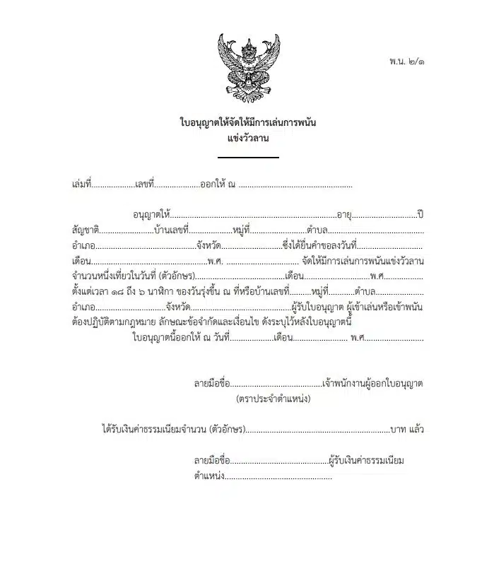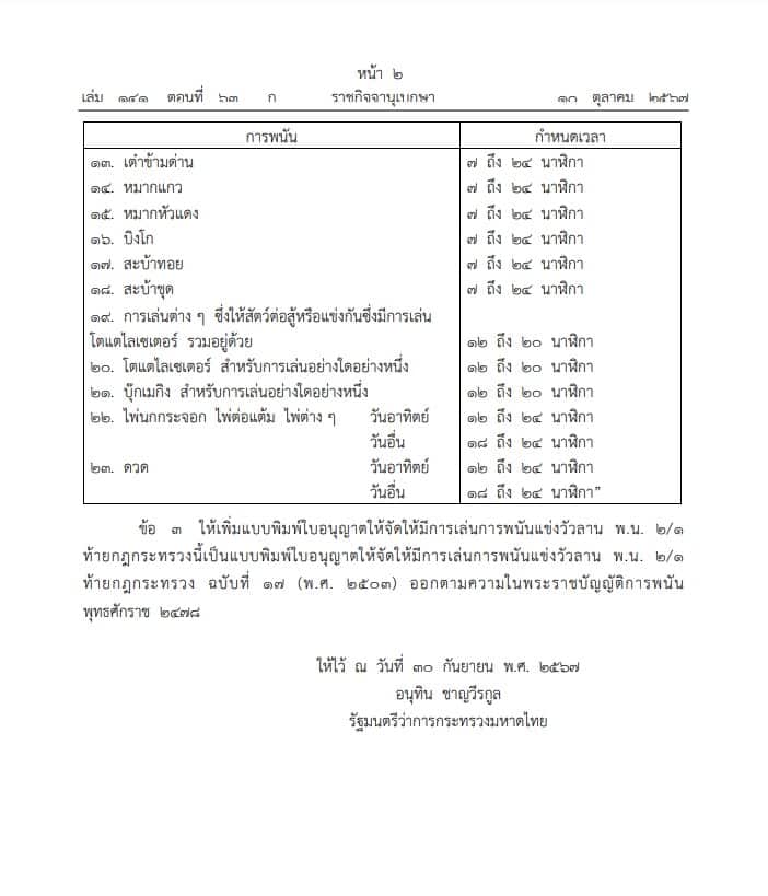 ราชกิจจานุเบกษา ออกประกาศอนุญาต การพนัน 23 ชนิด สามารถเล่นได้ในกำหนดเวลา เช่น แข่งเรือ ชกมวย มวยปล้ำ ไพ่นกกระจอก วิ่งวัวคน