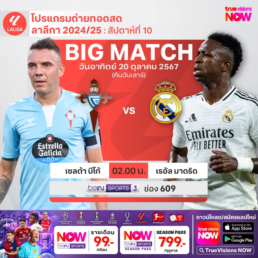 19 ตุลาคม 2567 เวลา 02.00 น. ถ่ายทอดสด ดูบอลสด ฟุตบอล ลาลีกา ฤดูกาล 2024/25 เซลต้า พบ เรอัล มาดริด The Thaiger พาไปวิเคราะห์เกม พร้อมการทำนายผล และคาดการณ์ 11 ตัวจริงได้ที่นี่