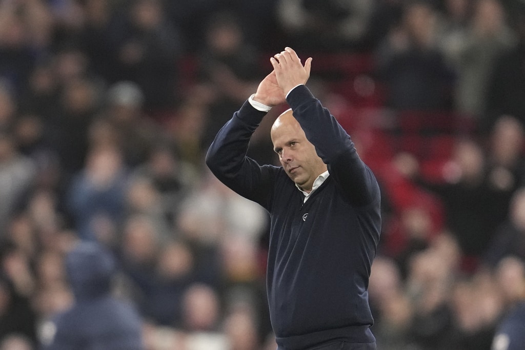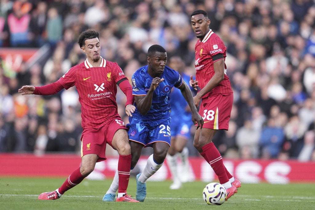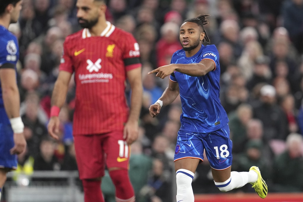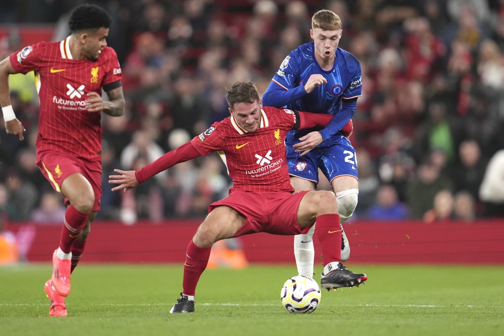 Liverpool’s Trent Alexander-Arnold, left, challenges for the ball with Chelsea’s Jadon Sancho during the English Premier League soccer match between Liverpool and Chelsea at Anfield Stadium, Liverpool, England, Sunday, Oct. 20, 2024. (AP Photo/Jon Super)Liverpool’s manager Arne Slot, right, greets Liverpool’s Virgil van Dijk at the end of the English Premier League soccer match between Liverpool and Chelsea at Anfield Stadium, Liverpool, England, Sunday, Oct. 20, 2024. (AP Photo/Jon Super)Liverpool’s manager Arne Slot applauds supporters at the end of the English Premier League soccer match between Liverpool and Chelsea at Anfield Stadium, Liverpool, England, Sunday, Oct. 20, 2024. (AP Photo/Jon Super)Liverpool’s Alexis Mac Allister, centre, challenges for the ball with Chelsea’s Cole Palmer, right, during the English Premier League soccer match between Liverpool and Chelsea at Anfield Stadium, Liverpool, England, Sunday, Oct. 20, 2024. (AP Photo/Jon Super)Liverpool’s Dominik Szoboszlai in action during the English Premier League soccer match between Liverpool and Chelsea at Anfield Stadium, Liverpool, England, Sunday, Oct. 20, 2024. (AP Photo/Jon Super)Chelsea’s Christopher Nkunku, right, reacts during the English Premier League soccer match between Liverpool and Chelsea at Anfield Stadium, Liverpool, England, Sunday, Oct. 20, 2024. (AP Photo/Jon Super)Liverpool’s Curtis Jones celebrates after scoring his side’s second goal during the English Premier League soccer match between Liverpool and Chelsea at Anfield Stadium, Liverpool, England, Sunday, Oct. 20, 2024. (AP Photo/Jon Super)Liverpool’s Mohamed Salah, right, kicks the ball ahead of Chelsea’s Levi Colwill during the English Premier League soccer match between Liverpool and Chelsea at Anfield Stadium, Liverpool, England, Sunday, Oct. 20, 2024. (AP Photo/Jon Super)Chelsea’s Moises Caicedo, centre, challenges for the ball with Liverpool’s Curtis Jones, left, and Liverpool’s Ryan Gravenberch during the English Premier League soccer match between Liverpool and Chelsea at Anfield Stadium, Liverpool, England, Sunday, Oct. 20, 2024. (AP Photo/Jon Super)
