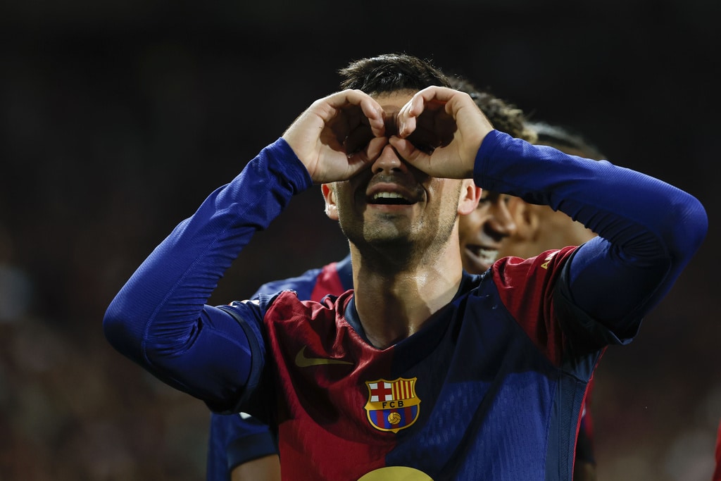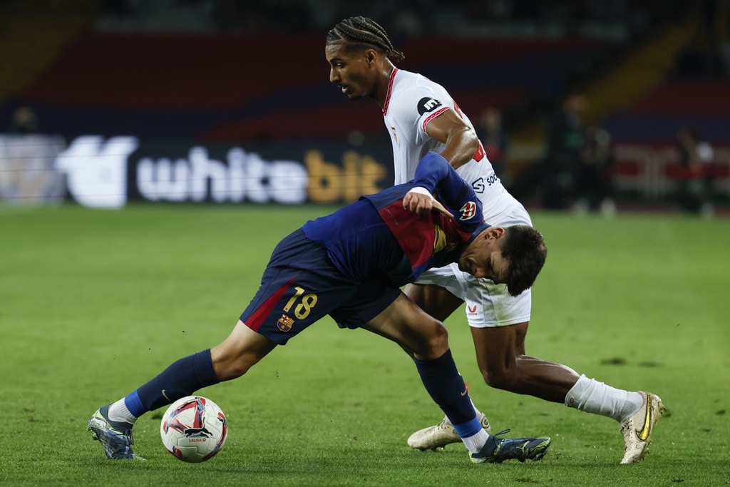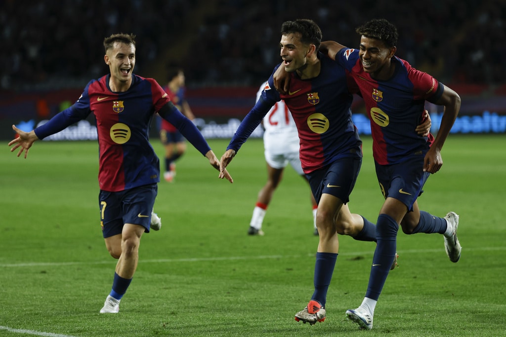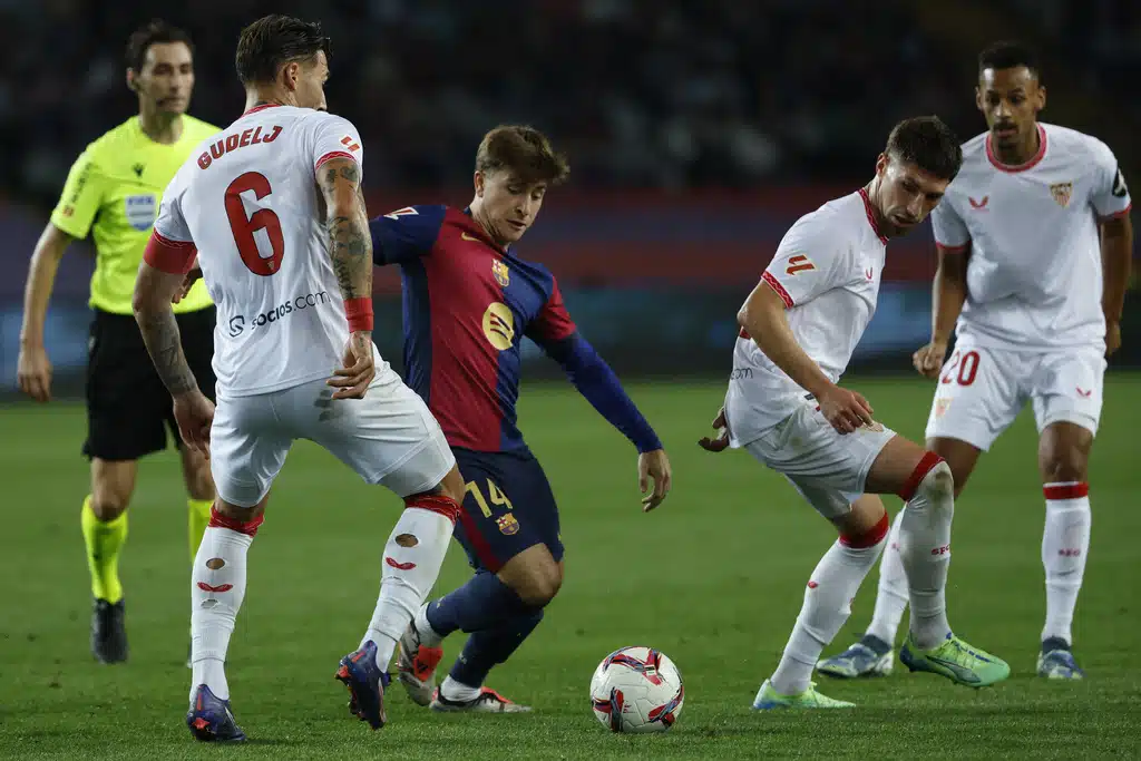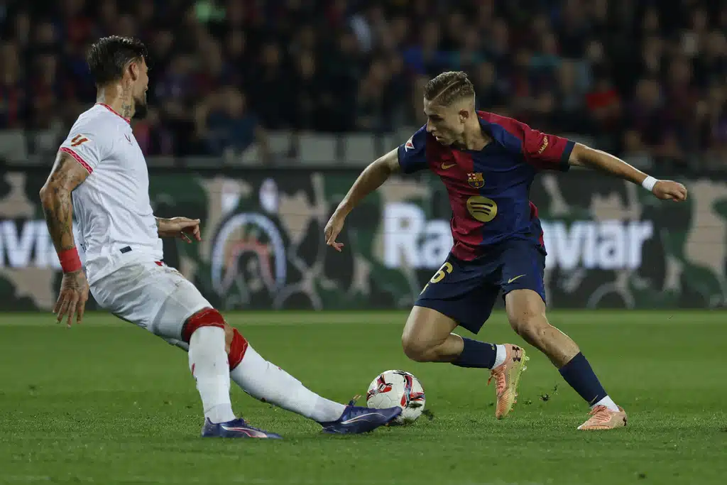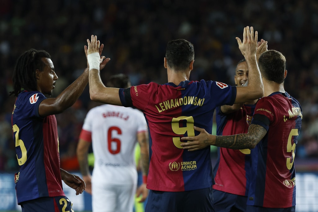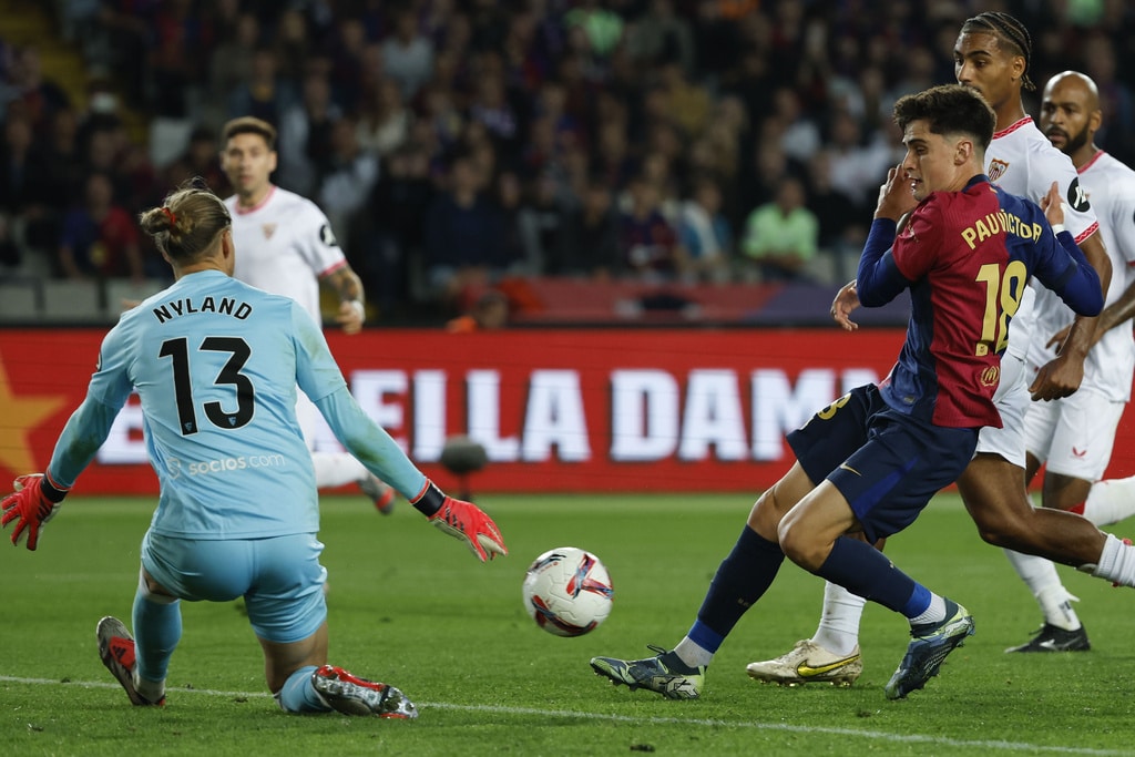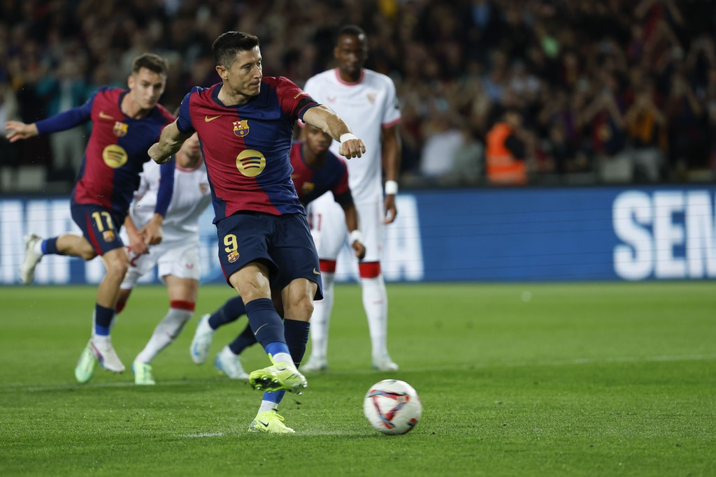 Barcelona’s Raphinha kicks the ball during a Spanish La Liga soccer match between Barcelona and Sevilla at the Olimpic Lluis Companys stadium in Barcelona, Spain, Sunday, Oct. 20, 2024. (AP Photo/Joan Monfort)Barcelona’s Pau Victor, front, duels for the ball with Sevilla’s Loic Bade during a Spanish La Liga soccer match between Barcelona and Sevilla at the Olimpic Lluis Companys stadium in Barcelona, Spain, Sunday, Oct. 20, 2024. (AP Photo/Joan Monfort)Sevilla’s goalkeeper Orjan Nyland, left, makes a save in front of Barcelona’s Pau Victor during a Spanish La Liga soccer match between Barcelona and Sevilla at the Olimpic Lluis Companys stadium in Barcelona, Spain, Sunday, Oct. 20, 2024. (AP Photo/Joan Monfort)Barcelona’s Fermin Lopez, right, duels for the ball with Sevilla’s Nemanja Gudelj during a Spanish La Liga soccer match between Barcelona and Sevilla at the Olimpic Lluis Companys stadium in Barcelona, Spain, Sunday, Oct. 20, 2024. (AP Photo/Joan Monfort)Barcelona’s Pablo Torre, center, duels for the ball with Sevilla’s Nemanja Gudelj, left, during a Spanish La Liga soccer match between Barcelona and Sevilla at the Olimpic Lluis Companys stadium in Barcelona, Spain, Sunday, Oct. 20, 2024. (AP Photo/Joan Monfort)Barcelona’s Pedri celebrates after scoring his side’s second goal during a Spanish La Liga soccer match between Barcelona and Sevilla at the Olimpic Lluis Companys stadium in Barcelona, Spain, Sunday, Oct. 20, 2024. (AP Photo/Joan Monfort)Barcelona’s Robert Lewandowski scores the opening goal from the penalty spot during a Spanish La Liga soccer match between Barcelona and Sevilla at the Olimpic Lluis Companys stadium in Barcelona, Spain, Sunday, Oct. 20, 2024. (AP Photo/Joan Monfort)Barcelona’s Robert Lewandowski, center, celebrates with teammates after scoring his side’s third goal during a Spanish La Liga soccer match between Barcelona and Sevilla at the Olimpic Lluis Companys stadium in Barcelona, Spain, Sunday, Oct. 20, 2024. (AP Photo/Joan Monfort)Barcelona’s Pedri, center, celebrates with teammates after scoring his side’s second goal during a Spanish La Liga soccer match between Barcelona and Sevilla at the Olimpic Lluis Companys stadium in Barcelona, Spain, Sunday, Oct. 20, 2024. (AP Photo/Joan Monfort)