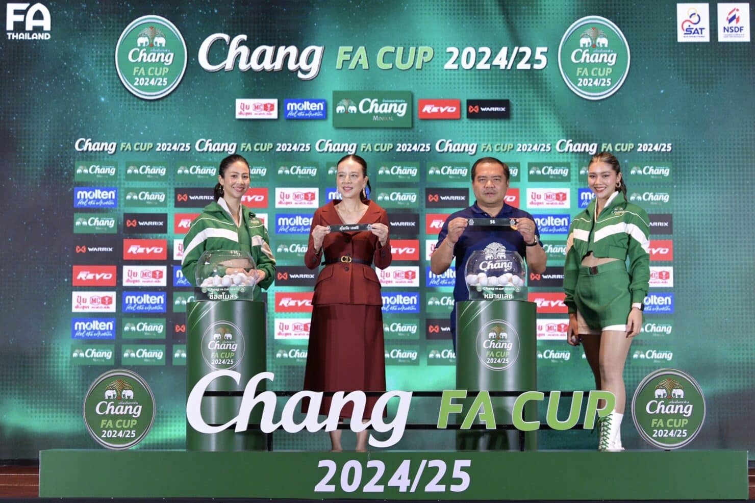 ภายในงานแถลงข่าว มาดามแป้ง นวลพรรณ ล่ำซำ นายกสมาคมกีฬาฟุตบอลแห่งประเทศไทย ในพระบรมราชูปถัมภ์ เป็นประธาน พร้อมด้วย คุณสุรพล อุทินทุ ผู้บริหารน้ำแร่ธรรมชาติตราช้าง, คุณแพทริค หอรัตนชัย ผู้บริหารน้ำแร่ธรรมชาติตราช้าง, คุณโชติรัฏฐ์ ศิริอัฐ ตัวแทนผลิตภัณฑ์น้ำแร่ธรรมชาติตราช้าง, คุณนิติพงษ์ ยวนตระกูล Brand Manager บริษัท วอริกซ์ สปอร์ต จำกัด (มหาชน), คุณก่องกานต์ กาทอง ผู้จัดการฝ่ายขายในประเทศ บริษัท มอลเทน (ไทยแลนด์) จำกัด, ผู้บริหารสโมสรฟุตบอล, ผู้สนับสนุนสมาคมฯ แขกผู้มีเกียรติ และสื่อมวลชนทุกท่าน