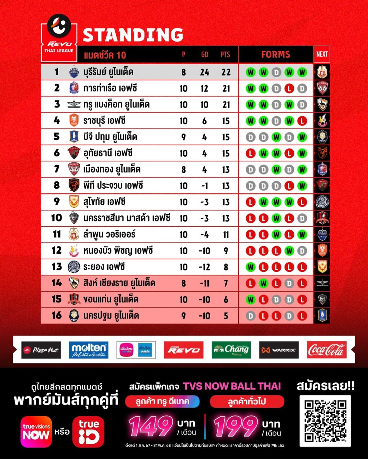 สรุปผลการแข่งขัน รีโว่ ไทยลีก 2024/25 หลังจบนัดที่ 10