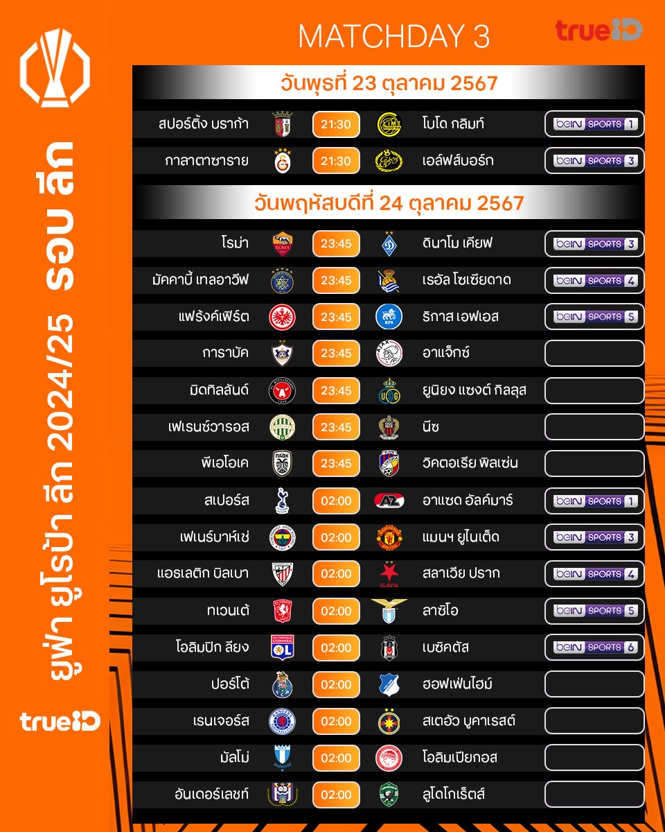 - 23.45 น. โรม่า พบ ดินาโม เคียฟ : beIN SPORTS 3