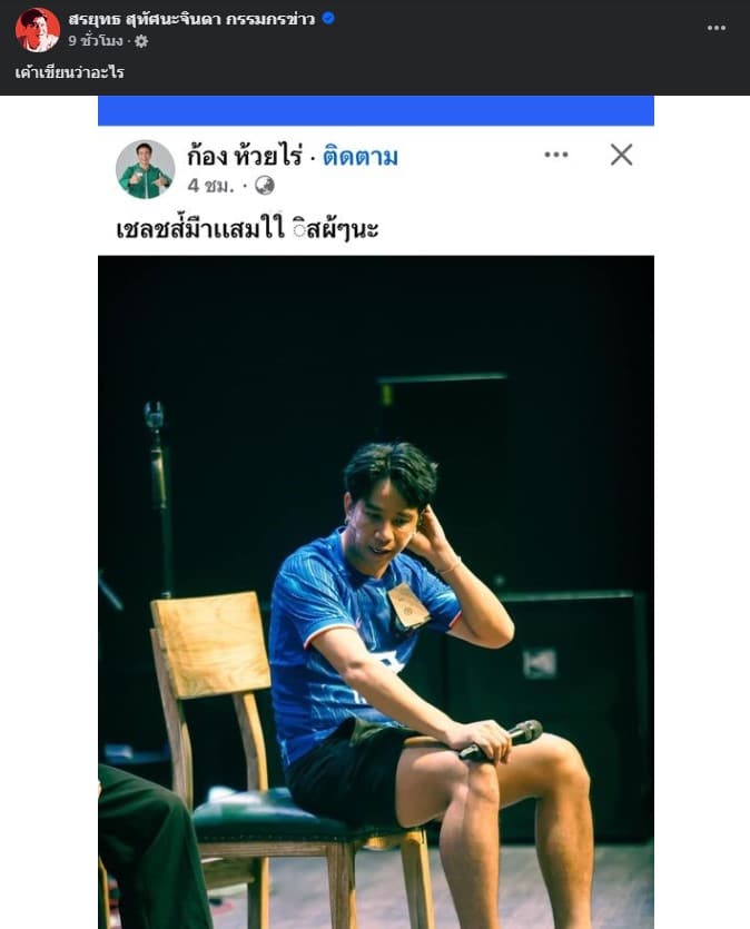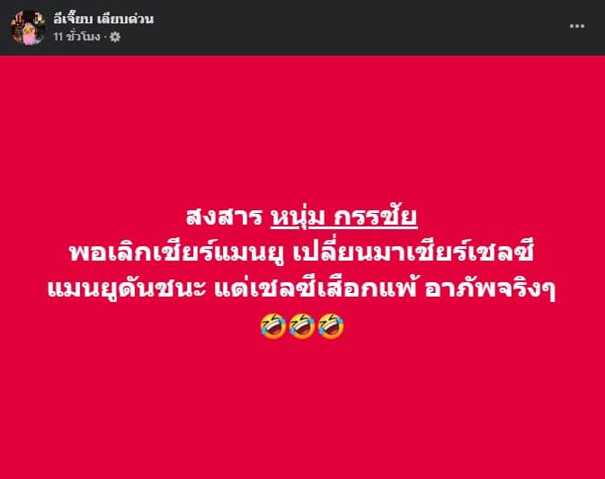 ในขณะที่อีกหนึ่งคนอย่าง ก้อง ห้วยไร่ ที่ประกาศของเปลี่ยนไปเชียร์ เชลซี ก็อาการหนักไม่แพ้กัน จนถึงขั้นที่เพจ สรยุทธ สุทัศนจินดา กรรมกรข่าว ต้องแชร์พร้อมแคปชั่นว่า “เค้าเขียนว่าอะไร”