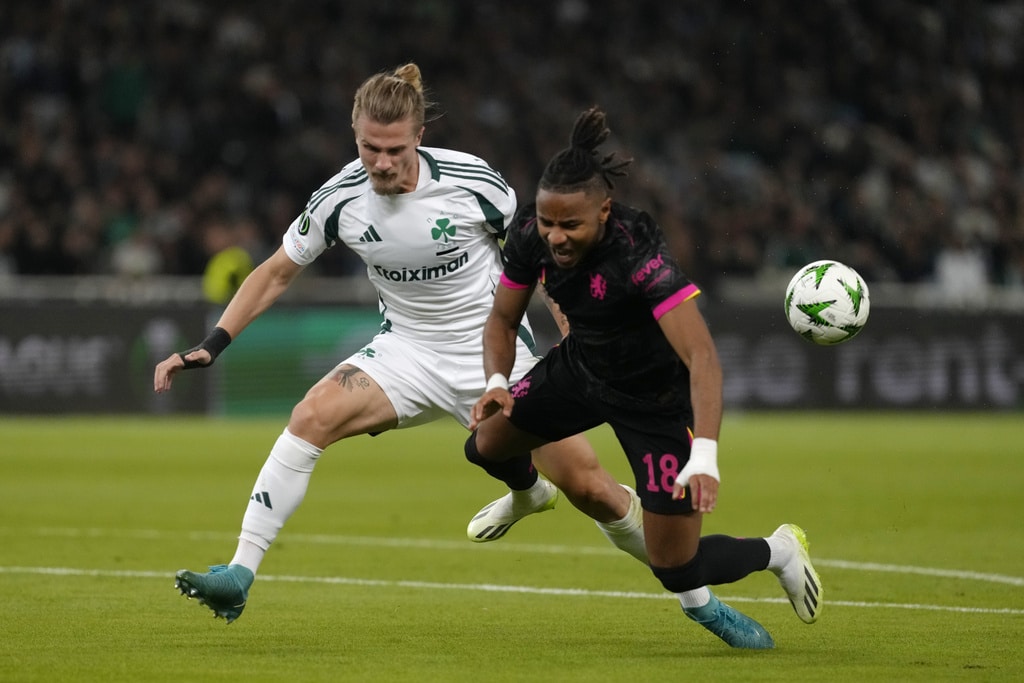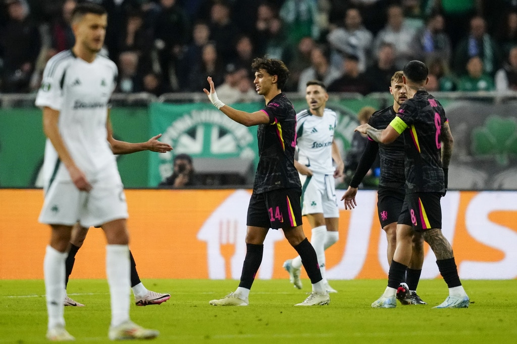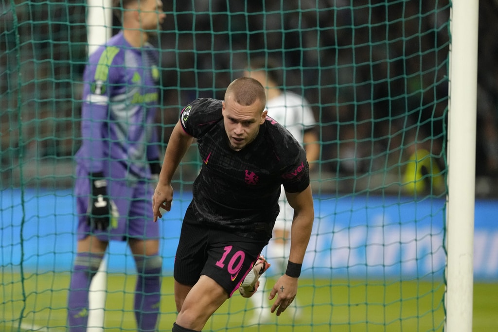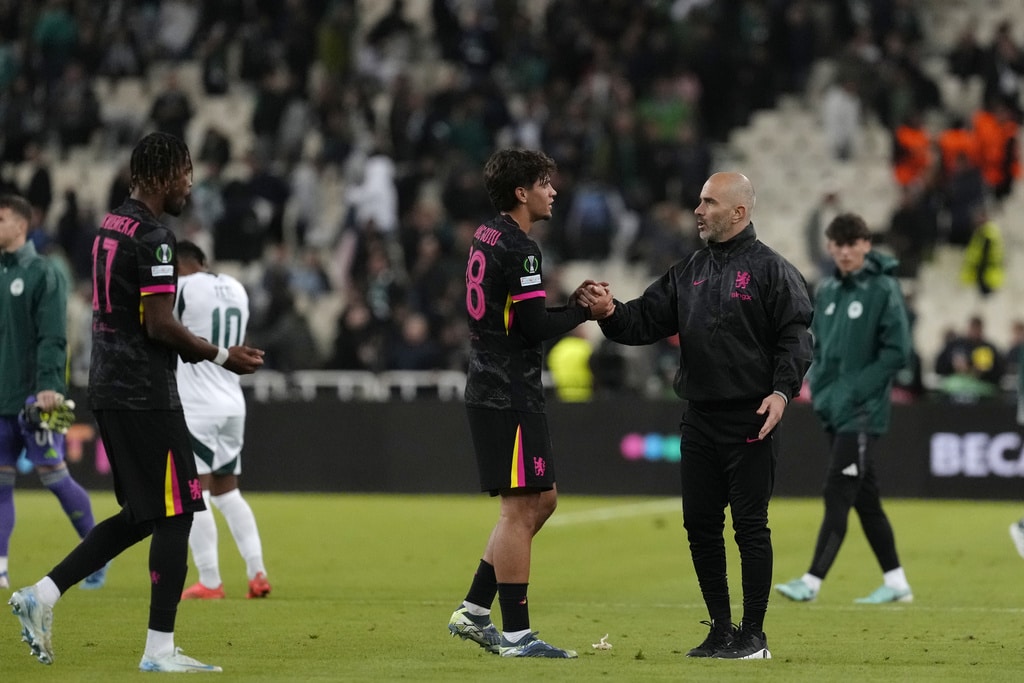Chelsea’s Mykhailo Mudryk reacts after scoring his side’s second goal during the Europa Conference League opening phase soccer match between Panathinaikos and Chelsea at the Olympic stadium in Athens, Greece, Thursday, Oct. 24, 2024. (AP Photo/Petros Giannakouris)Chelsea’s head coach Enzo Maresca, right, talks with his player Marc Guiu during the Europa Conference League opening phase soccer match between Panathinaikos and Chelsea at the Olympic stadium in Athens, Greece, Thursday, Oct. 24, 2024. (AP Photo/Petros Giannakouris)Panathinaikos’ Georgios Vagiannidis, left, and Chelsea’s Marc Cucurella vie for the ball during the Europa Conference League opening phase soccer match between Panathinaikos and Chelsea at the Olympic stadium in Athens, Greece, Thursday, Oct. 24, 2024. (AP Photo/Thanassis Stavrakis)Chelsea’s Christopher Nkunku, right, challenges for the ball with Panathinaikos’ Nemanja Maksimovic during the Europa Conference League opening phase soccer match between Panathinaikos and Chelsea at the Olympic stadium in Athens, Greece, Thursday, Oct. 24, 2024. (AP Photo/Petros Giannakouris)Chelsea’s Mykhailo Mudryk, right, is challenged by Panathinaikos’ Georgios Vagiannidis during the Europa Conference League opening phase soccer match between Panathinaikos and Chelsea at the Olympic stadium in Athens, Greece, Thursday, Oct. 24, 2024. (AP Photo/Thanassis Stavrakis)Chelsea’s Christopher Nkunku celebrates after scoring his side’s fourth goal during the Europa Conference League opening phase soccer match between Panathinaikos and Chelsea at the Olympic stadium in Athens, Greece, Thursday, Oct. 24, 2024. (AP Photo/Petros Giannakouris)Chelsea’s Christopher Nkunku, right, scores his side’s fourth goal from a penalty kick during the Europa Conference League opening phase soccer match between Panathinaikos and Chelsea at the Olympic stadium in Athens, Greece, Thursday, Oct. 24, 2024. (AP Photo/Thanassis Stavrakis)Chelsea’s Marc Cucurella, rear, and Panathinaikos’ Azzedine Ounahi vie for the ball during the Europa Conference League opening phase soccer match between Panathinaikos and Chelsea at the Olympic stadium in Athens, Greece, Thursday, Oct. 24, 2024. (AP Photo/Thanassis Stavrakis)Chelsea’s Joao Felix, centre, celebrates after scoring his side’s third goal during the Europa Conference League opening phase soccer match between Panathinaikos and Chelsea at the Olympic stadium in Athens, Greece, Thursday, Oct. 24, 2024. (AP Photo/Thanassis Stavrakis)