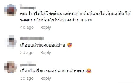 ด้านแฟนคลับที่ติดตามสาวปายหลังจากที่ได้ฟังเรื่องเล่าดังกล่าวแล้วต่างก็เข้ามาแสดงความคิดเห็นกันอย่างมากมาย โดยบอกว่าเกือบได้เป็นบิ๊กบอสและต้องไปออกรายการโหนกระแสเสียแล้ว