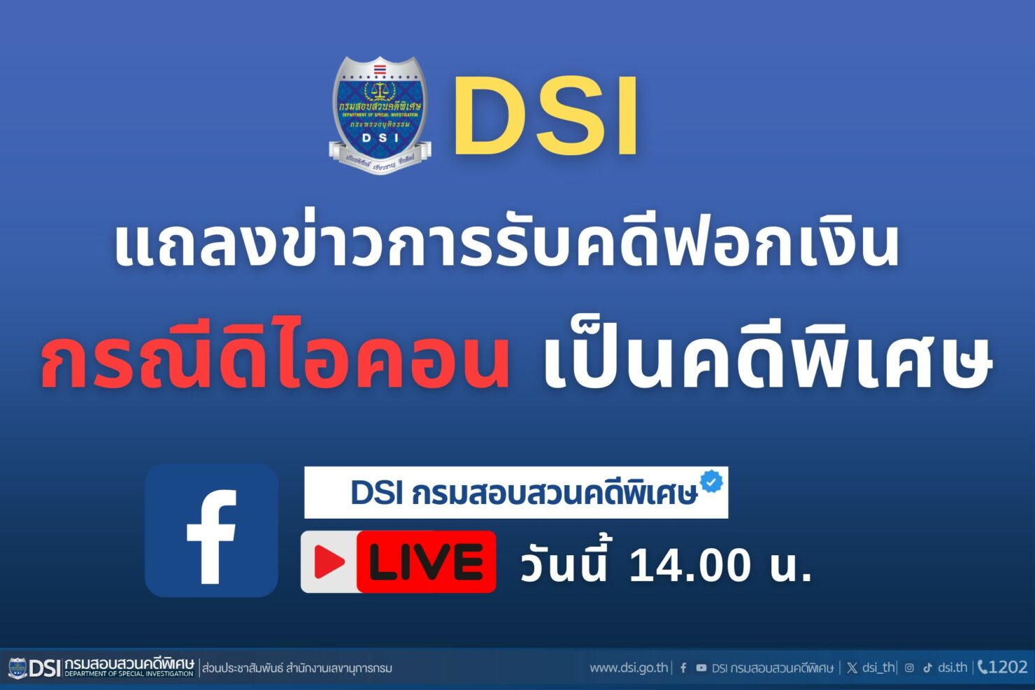 พันตำรวจตรี ยุทธนา แพรดำ รักษาราชการแทนอธิบดีกรมสอบสวนคดีพิเศษ หรือ DSI แถลงข่าวการรับคดีฟอกเงิน กรณีดิไอคอน เป็นคดีพิเศษ โดยจะมีการแถลงข่าวถึงประเด็นดังกล่าว ณ กรมสอบสวนคดีพิเศษ ชั้น 2 อาคารราชบุรีดิเรกฤทธิ์ (อาคารเอ) ถนนแจ้งวัฒนะ วันนี้เวลา 14.00 น. ซึ่งจะมีการไลฟ์สดผ่านเฟซบุ๊กต่อไป