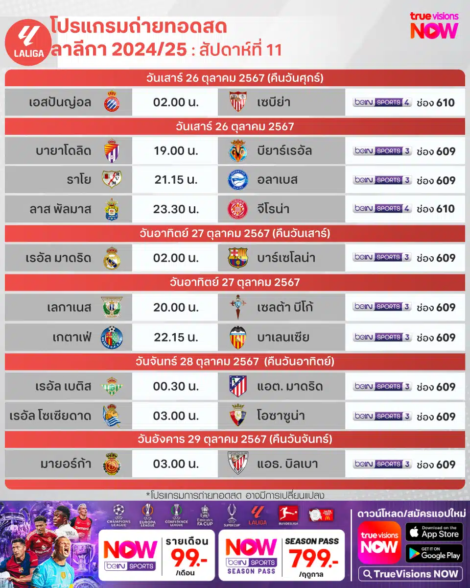 โปรแกรม ลาลีกา สเปน ประจำฤดูกาล 2024/25 สัปดาห์ที่ 11 ถ่ายทอดสดทางช่อง beIN Sport
