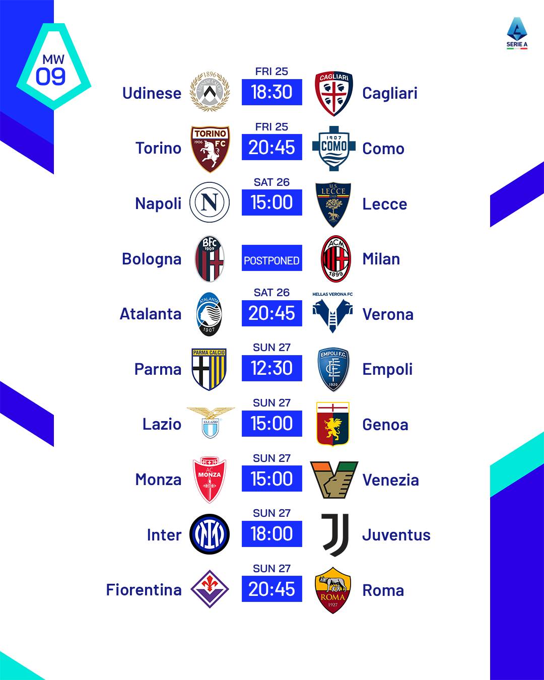 โปรแกรม กัลโช่ เซเรีย อา ประจำฤดูกาล 2024/25 สัปดาห์ที่ 9 ทุกคู่ (เวลาไทย)